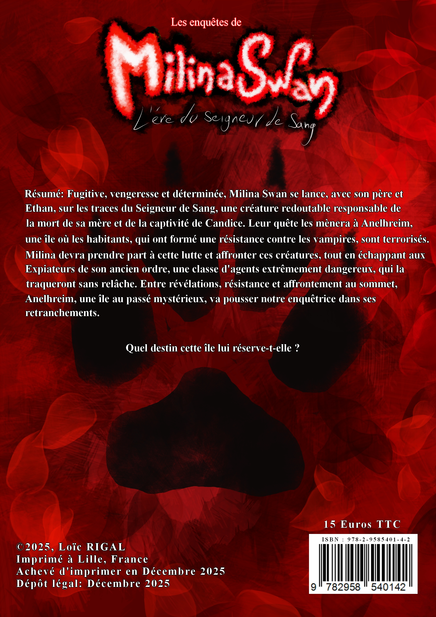 Fugitive, vengeresse et déterminée, Milina Swan se lance, avec son père et Ethan, sur les traces du Seigneur de Sang, une créature redoutable responsable de la mort de sa mère et de la captivité de Candice. Leur quête les mènera à Anelhreim, une île où les habitants, qui ont formé une résistance contre les vampires, sont terrorisés. Milina devra prendre part à cette lutte et affronter ces créatures, tout en échappant aux Expiateurs de son ancien ordre, une classe d'agents extrêmement dangereux, qui la traqueront sans relâche. Entre révélations, résistance et affrontement au sommet, Anelhreim, une île au passé mystérieux, va pousser notre enquêtrice dans ses retranchements.