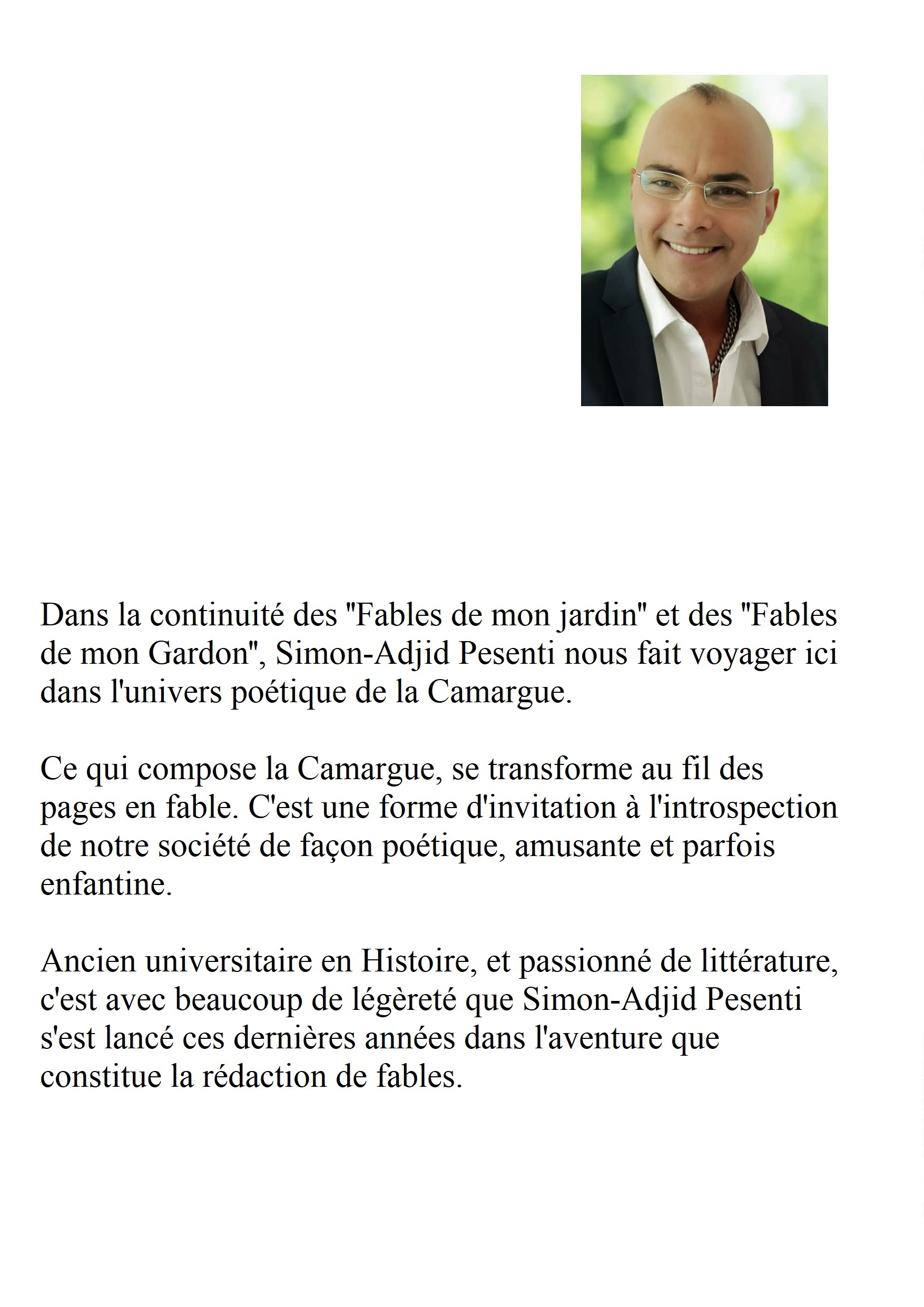 Dans la continuité des ''Fables de mon jardin'' et des ''Fables de mon Gardon'', Simon-Adjid Pesenti nous fait voyager ici dans l'univers poétique de la Camargue.