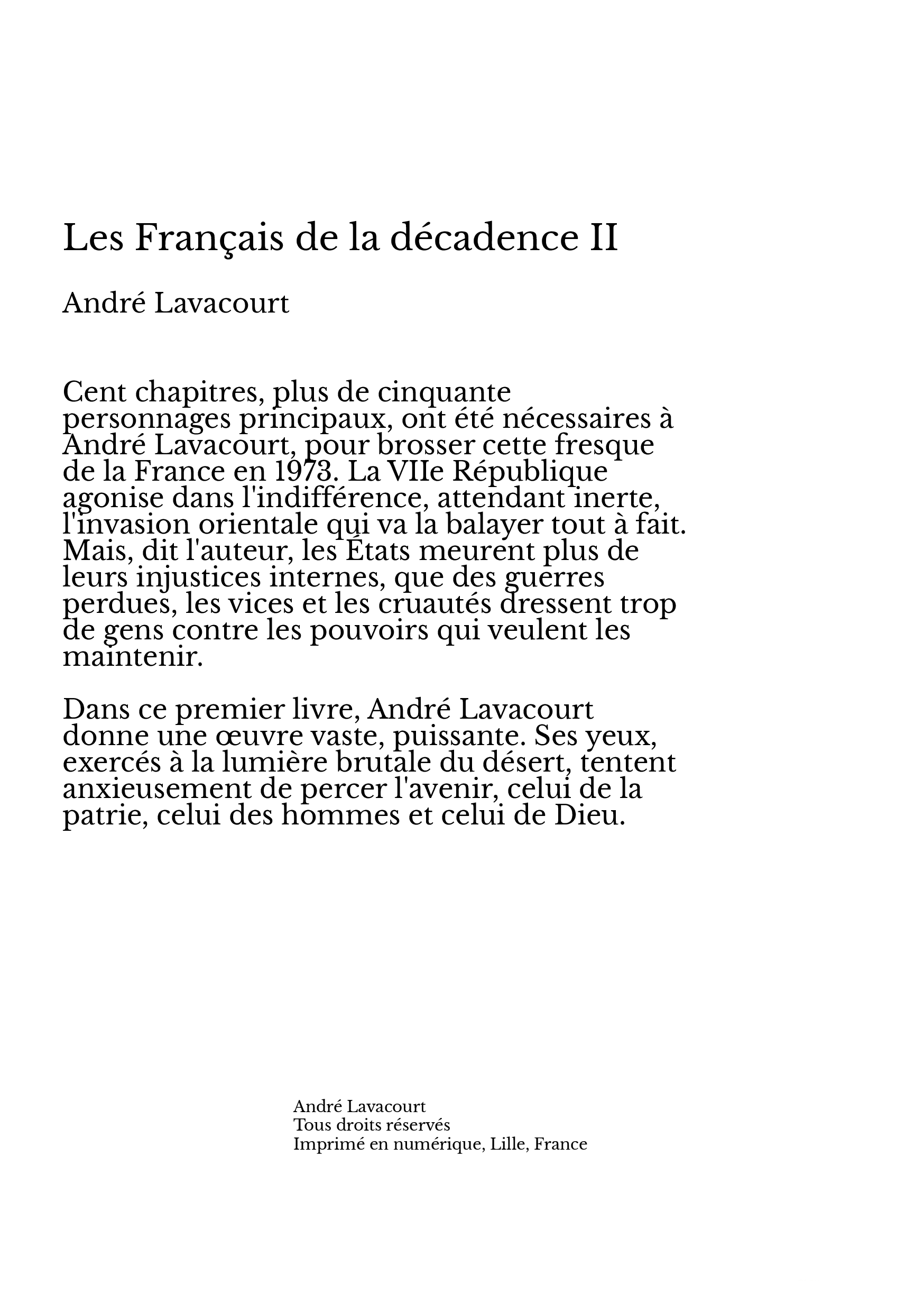 Cent chapitres, plus de cinquante personnages principaux, ont été nécessaires à André Lavacourt, pour brosser cette fresque de la France en 1973. La VIIe République agonise dans l'indifférence, attendant inerte, l'invasion orientale qui va la balayer tout à fait. Mais, dit l'auteur, les États meurent plus de leurs injustices internes, que des guerres perdues, les vices et les cruautés dressent trop de gens contre les pouvoirs qui veulent les maintenir.