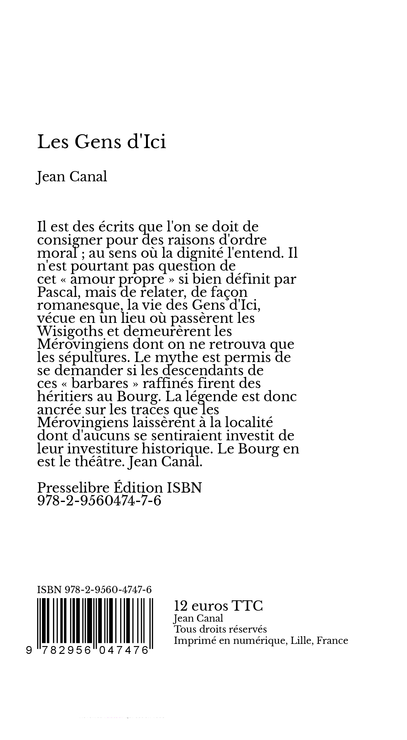 Il est des écrits que l'on se doit de consigner pour des raisons d'ordre moral ; au sens où la dignité l'entend. Il n'est pourtant pas question de cet « amour propre » si bien définit par Pascal, mais de relater, de façon romanesque, la vie des Gens d'Ici, vécue en un lieu où passèrent les Wisigoths et demeurèrent les Mérovingiens dont on ne retrouva que les sépultures. Le mythe est permis de se demander si les descendants de ces « barbares » raffinés firent des héritiers au Bourg. La légende est donc ancrée sur les traces que les Mérovingiens laissèrent à la localité dont d'aucuns se sentiraient investit de leur investiture historique. Le Bourg en est le théâtre. Jean Canal.