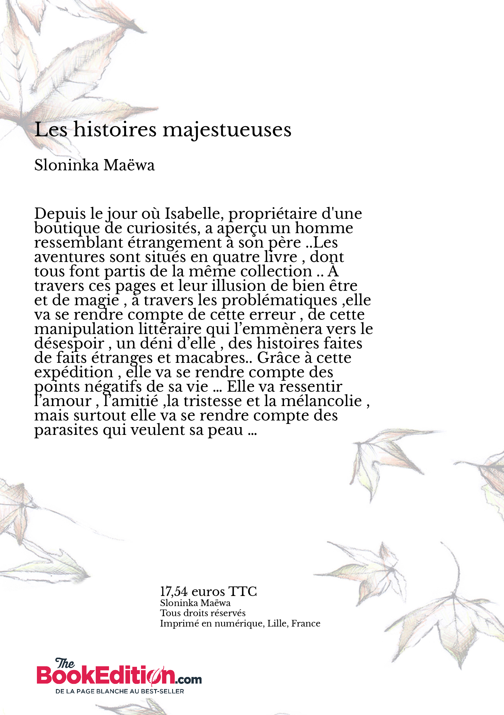 Depuis le jour où Isabelle, propriétaire d'une boutique de curiosités, a aperçu un homme ressemblant étrangement à son père ..Les aventures sont situés en quatre livre , dont tous font partis de la même collection .. À travers ces pages et leur illusion de bien être et de magie , à travers les problématiques ,elle va se rendre compte de cette erreur , de cette manipulation littéraire qui l’emmènera vers le désespoir , un déni d’elle , des histoires faites de faits étranges et macabres.. Grâce à cette expédition , elle va se rendre compte des points négatifs de sa vie … Elle va ressentir l’amour , l’amitié ,la tristesse et la mélancolie ,mais surtout elle va se rendre compte des parasites qui veulent sa peau …