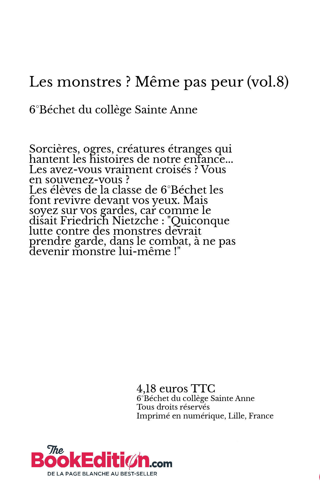 Sorcières, ogres, créatures étranges qui hantent les histoires de notre enfance... Les avez-vous vraiment croisés ? Vous en souvenez-vous ? Les élèves de la classe de 6°Béchet les font revivre devant vos yeux. Mais soyez sur vos gardes, car comme le disait Friedrich Nietzche : "Quiconque lutte contre des monstres devrait prendre garde, dans le combat, à ne pas devenir monstre lui-même !"
