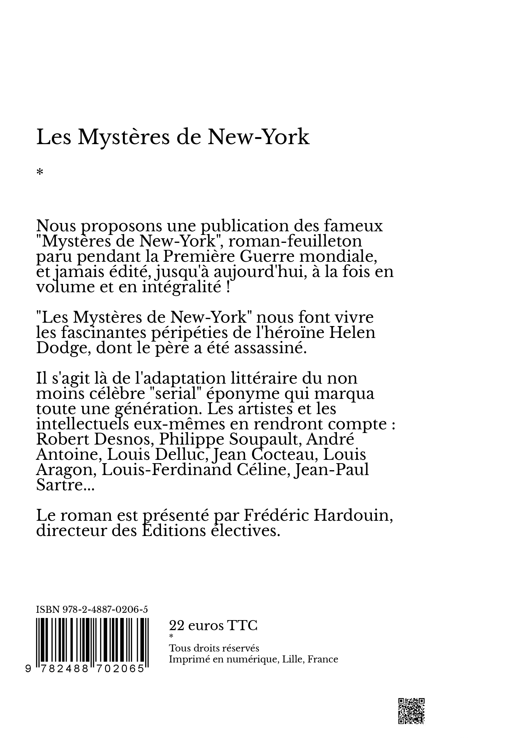 Le roman est présenté par Frédéric Hardouin, directeur des Éditions électives.