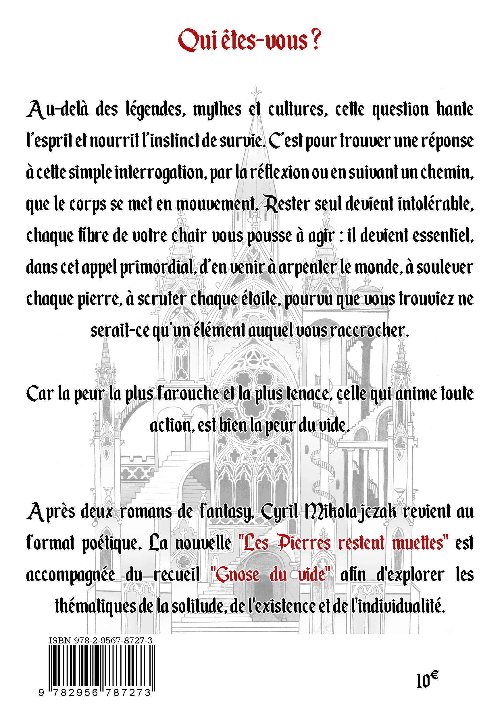 Après deux romans de fantasy, Cyril Mikolajczak revient au format poétique. La nouvelle "Les Pierres restent muettes" est accompagnée du recueil "Gnose du vide" afin d'explorer les thématiques de la solitude, de l'existence et de l'individualité.