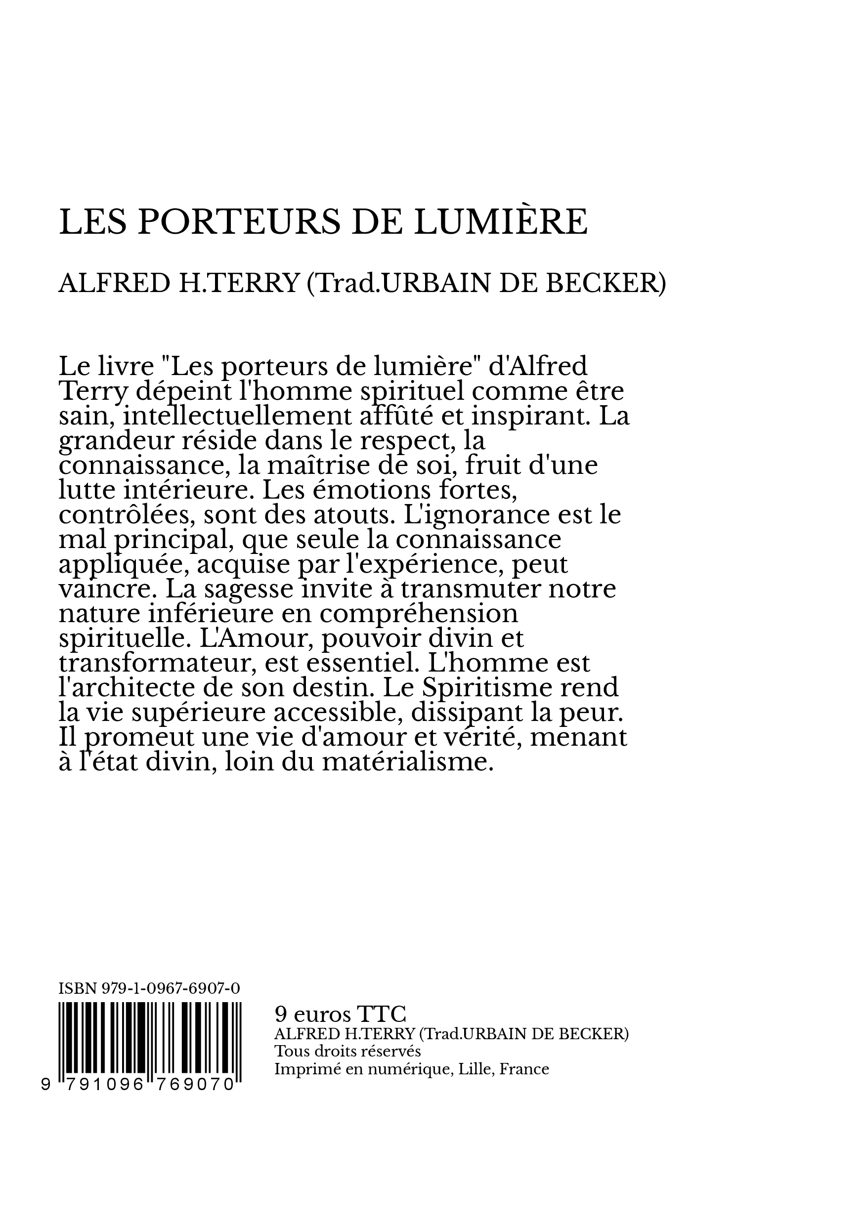 Le livre "Les porteurs de lumière" d'Alfred Terry dépeint l'homme spirituel comme être sain, intellectuellement affûté et inspirant. La grandeur réside dans le respect, la connaissance, la maîtrise de soi, fruit d'une lutte intérieure. Les émotions fortes, contrôlées, sont des atouts. L'ignorance est le mal principal, que seule la connaissance appliquée, acquise par l'expérience, peut vaincre. La sagesse invite à transmuter notre nature inférieure en compréhension spirituelle. L'Amour, pouvoir divin et transformateur, est essentiel. L'homme est l'architecte de son destin. Le Spiritisme rend la vie supérieure accessible, dissipant la peur. Il promeut une vie d'amour et vérité, menant à l'état divin, loin du matérialisme.