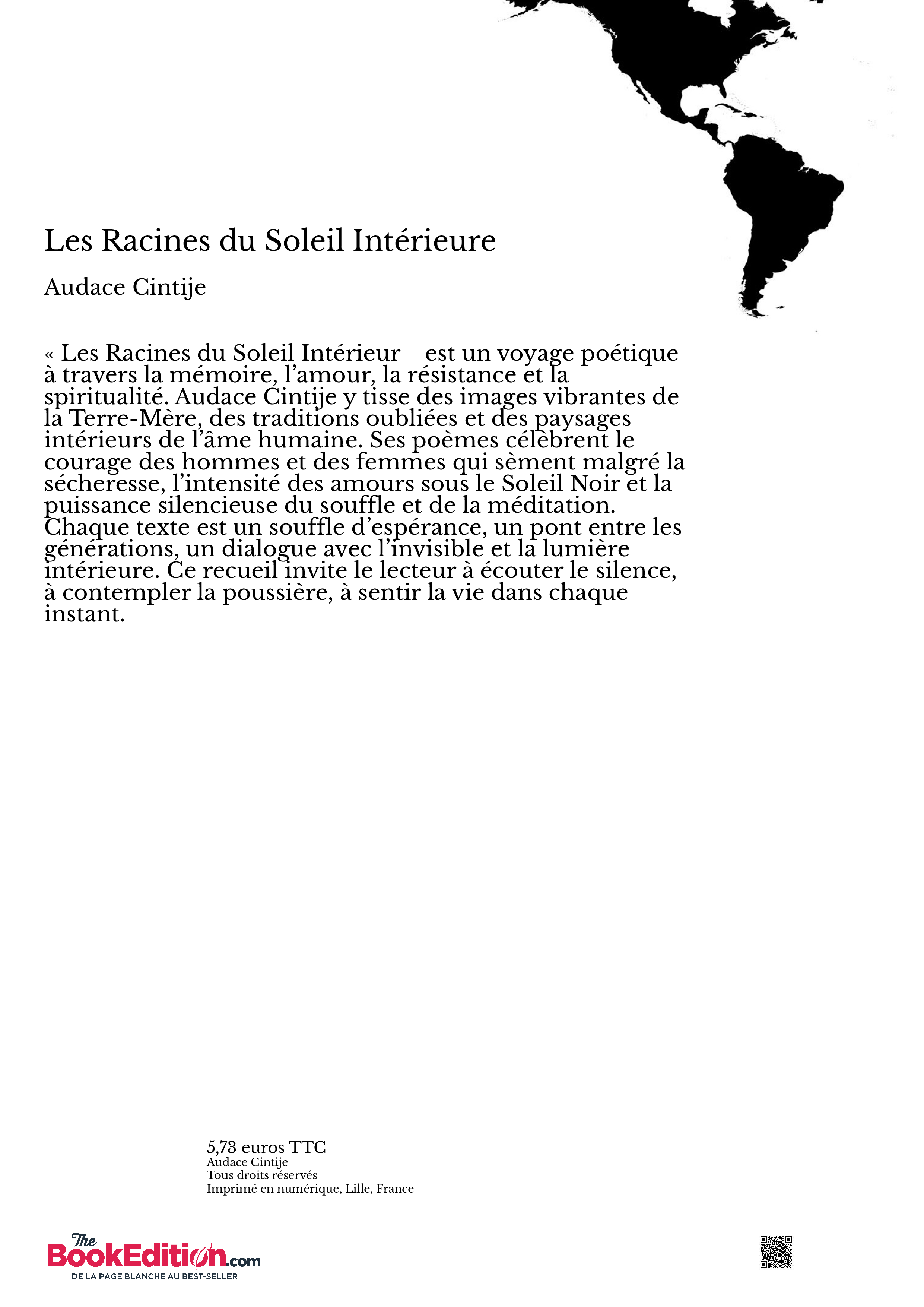 « Les Racines du Soleil Intérieur » est un voyage poétique à travers la mémoire, l’amour, la résistance et la spiritualité. Audace Cintije y tisse des images vibrantes de la Terre-Mère, des traditions oubliées et des paysages intérieurs de l’âme humaine. Ses poèmes célèbrent le courage des hommes et des femmes qui sèment malgré la sécheresse, l’intensité des amours sous le Soleil Noir et la puissance silencieuse du souffle et de la méditation. Chaque texte est un souffle d’espérance, un pont entre les générations, un dialogue avec l’invisible et la lumière intérieure. Ce recueil invite le lecteur à écouter le silence, à contempler la poussière, à sentir la vie dans chaque instant.