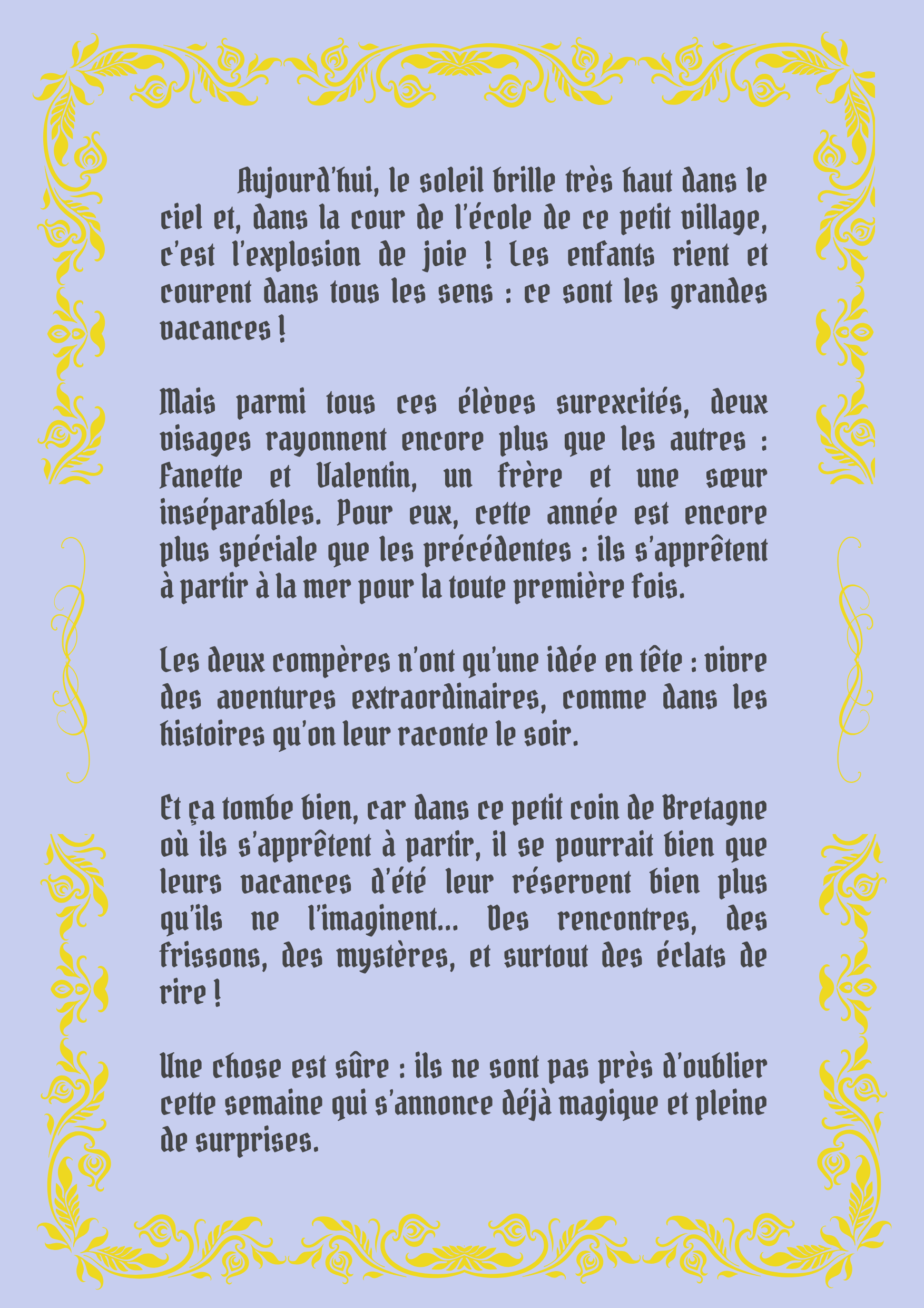 Pour Fanette et Valentin, cette année est encore plus spéciale que les précédentes : ils s’apprêtent à partir à la mer pour la toute première fois. Entre frissons d’excitation et élans de joie, les deux compères n’ont qu’une idée en tête : vivre des aventures extraordinaires, comme dans les histoires qu’on leur raconte le soir.
