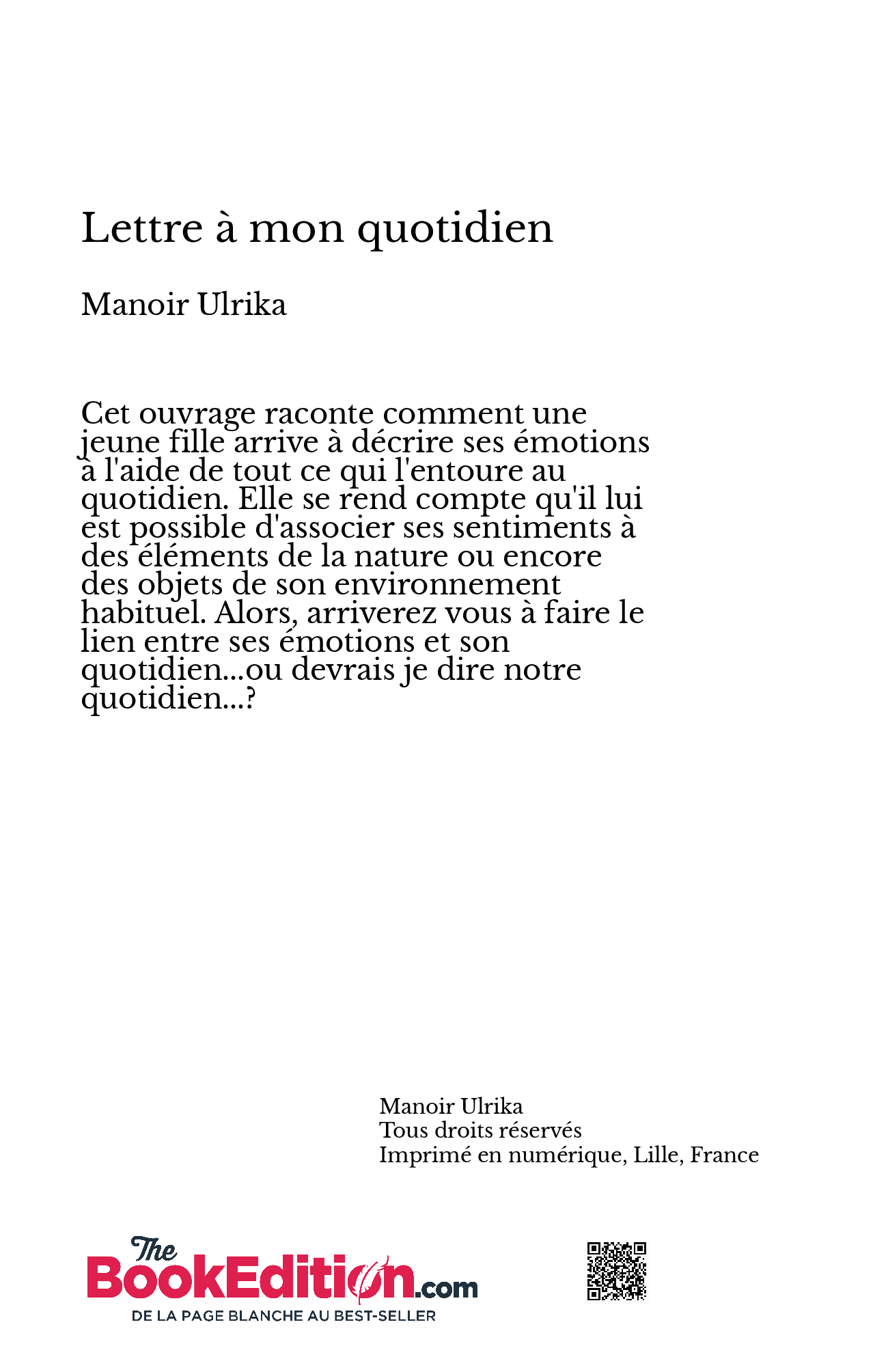 Cet ouvrage raconte comment une jeune fille arrive à décrire ses émotions à l'aide de tout ce qui l'entoure au quotidien. Elle se rend compte qu'il lui est possible d'associer ses sentiments à des éléments de la nature ou encore des objets de son environnement habituel. Alors, arriverez vous à faire le lien entre ses émotions et son quotidien...ou devrais je dire notre quotidien...?
