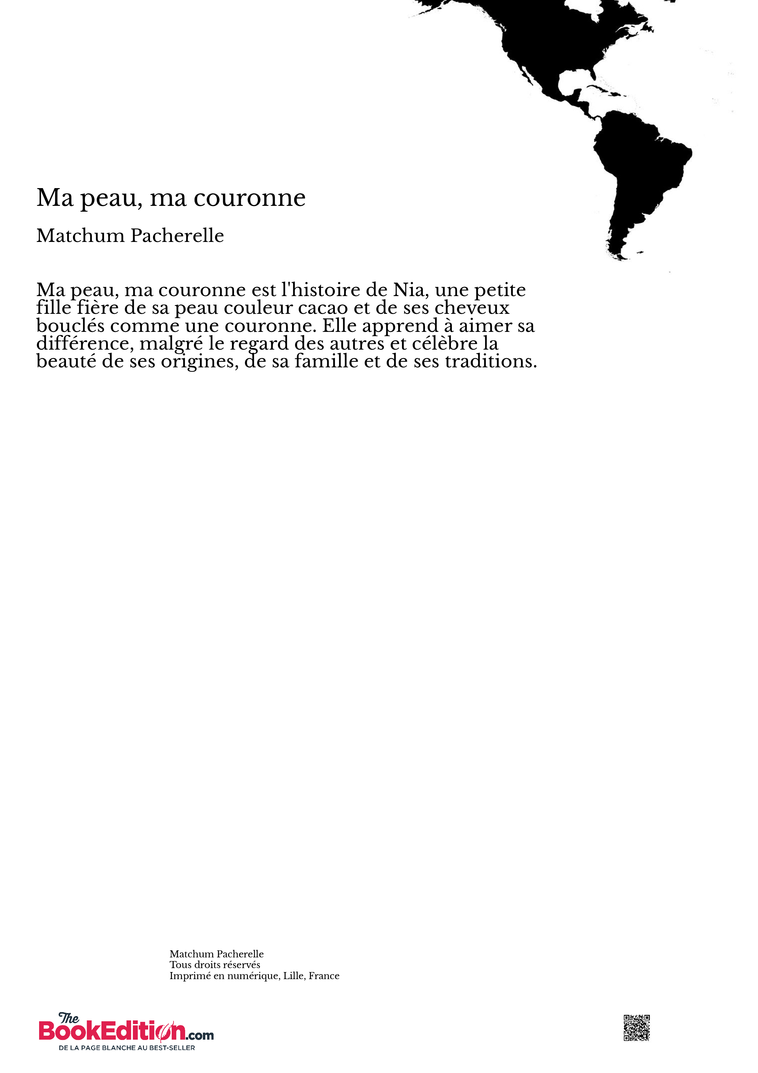 Ma peau, ma couronne est l'histoire de Nia, une petite fille fière de sa peau couleur cacao et de ses cheveux bouclés comme une couronne. Elle apprend à aimer sa différence, malgré le regard des autres et célèbre la beauté de ses origines, de sa famille et de ses traditions.