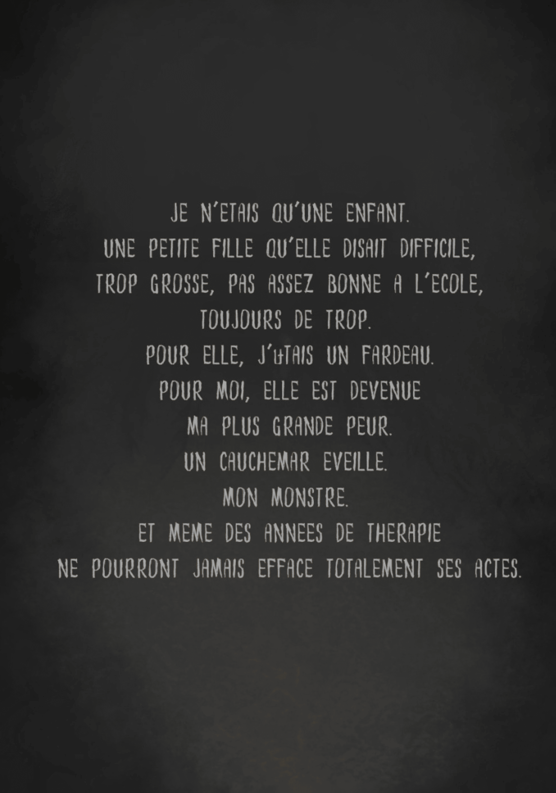 Ce livre est un témoignage autobiographique d’une enfance et d’une adolescence marquées par la violence physique, psychologique et l’humiliation infligées par une mère abusive. À travers des souvenirs bruts et sans fard, l’autrice raconte les coups, la peur, le silence des adultes et l’échec des tentatives d’aide. Devenue adolescente puis jeune adulte, elle décrit les séquelles profondes laissées par ces violences : dépendance affective, scarifications, perte d’estime de soi. Ce récit est celui d’une survivante qui reprend la parole pour comprendre, se reconstruire et rappeler que la violence familiale n’est jamais normale.