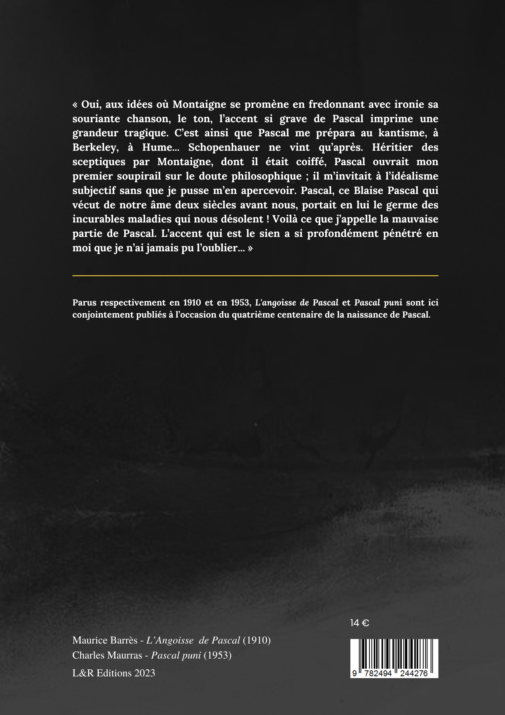 Parus respectivement en 1910 et en 1953, L'angoisse de Pascal et Pascal puni sont des textes très différents mais très complémentaires. Ils montrent les analyses aux antipodes que font Barrès et Maurras de l'auteur des Pensées. Là où Barrès enquête sur "l'angoisse" au cœur des préoccupations pascalienne, l'auteur de Mes Idées Politiques et de l'Enquête sur la monarchie se fait un contempteur féroce de Pascal. "Pascal, ce Blaise Pascal qui vécut de notre âme deux siècles avant nous, portait en lui le germe des incurables maladies qui nous désolent !"