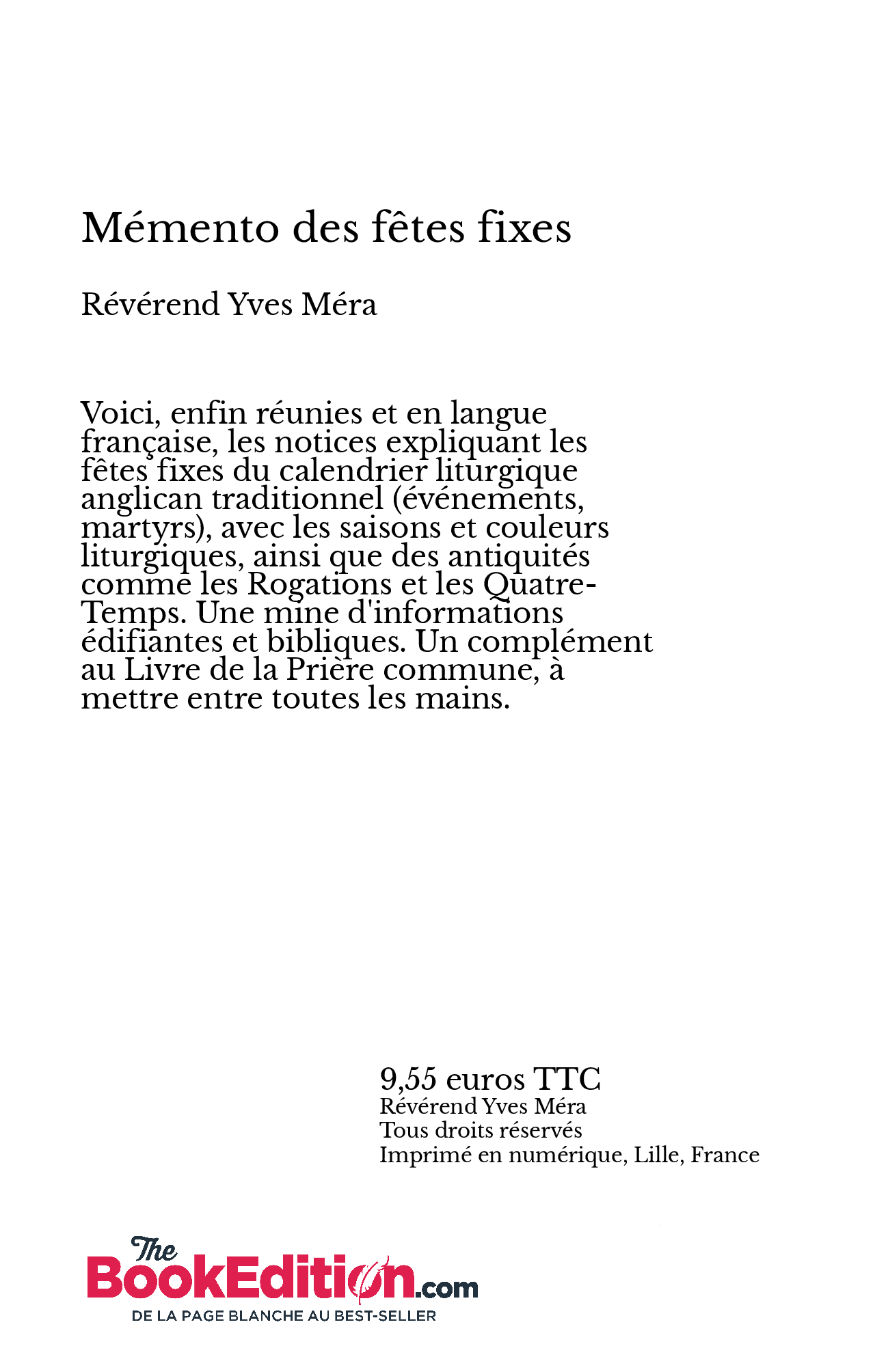 Voici, enfin réunies et en langue française, les notices expliquant les fêtes fixes du calendrier liturgique anglican traditionnel (événements, martyrs), avec les saisons et couleurs liturgiques, ainsi que des antiquités comme les Rogations et les Quatre-Temps. Une mine d'informations édifiantes et bibliques. Un complément au Livre de la Prière commune, à mettre entre toutes les mains.