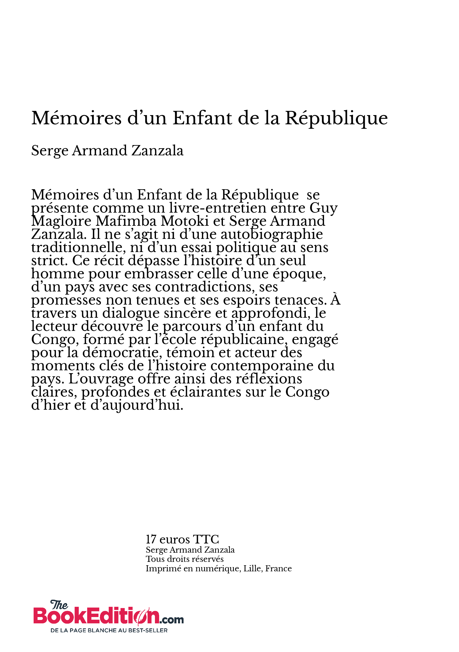 Mémoires d’un Enfant de la République se présente comme un livre-entretien entre Guy Magloire Mafimba Motoki et Serge Armand Zanzala. Il ne s’agit ni d’une autobiographie traditionnelle, ni d’un essai politique au sens strict. Ce récit dépasse l’histoire d’un seul homme pour embrasser celle d’une époque, d’un pays avec ses contradictions, ses promesses non tenues et ses espoirs tenaces. À travers un dialogue sincère et approfondi, le lecteur découvre le parcours d’un enfant du Congo, formé par l’école républicaine, engagé pour la démocratie, témoin et acteur des moments clés de l’histoire contemporaine du pays. L’ouvrage offre ainsi des réflexions claires, profondes et éclairantes sur le Congo d’hier et d’aujourd’hui.