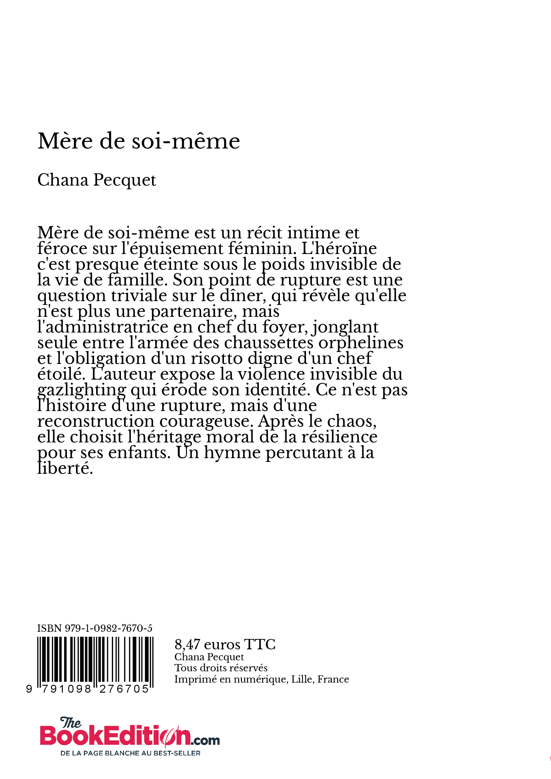 Mère de soi-même est un récit intime et féroce sur l'épuisement féminin. L'héroïne c'est presque éteinte sous le poids invisible de la vie de famille. Son point de rupture est une question triviale sur le dîner, qui révèle qu'elle n'est plus une partenaire, mais l'administratrice en chef du foyer, jonglant seule entre l'armée des chaussettes orphelines et l'obligation d'un risotto digne d'un chef étoilé. L'auteur expose la violence invisible du gazlighting qui érode son identité. Ce n'est pas l'histoire d'une rupture, mais d'une reconstruction courageuse. Après le chaos, elle choisit l'héritage moral de la résilience pour ses enfants. Un hymne percutant à la liberté.