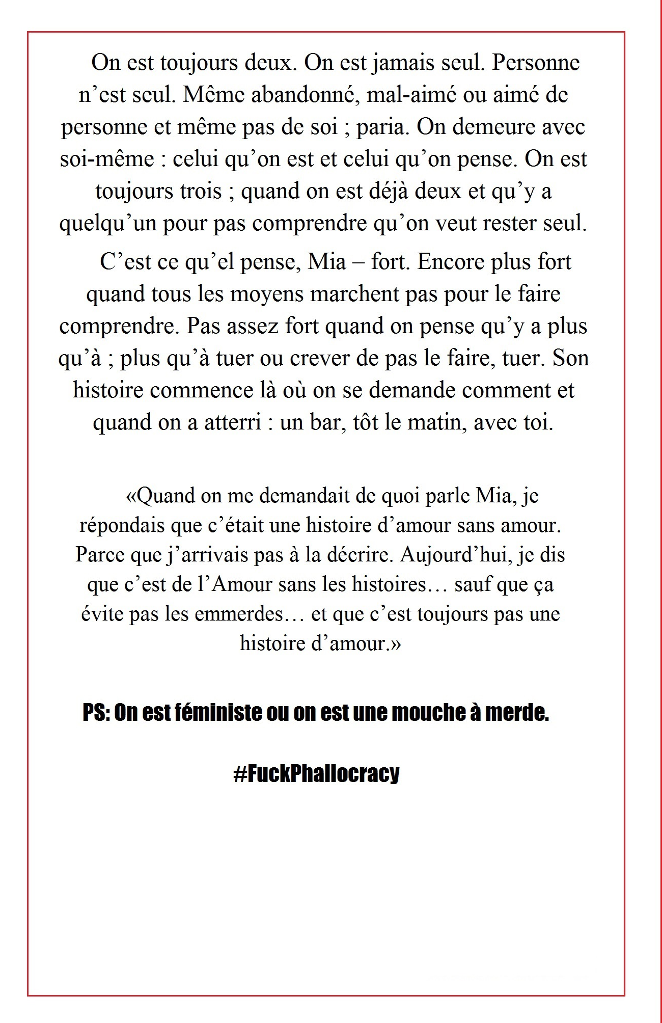 L'auteur ne se fatigue pas à tout expliquer, c'est au lecteur de courir après Mia pour savoir qui elle est, avec qui et pourquoi. Une fois à bord, tout change. On se met à comprendre qu'on ne comprendra pas plus mais avec la sentiment délicieux d'assister à quelque chose de particulier.