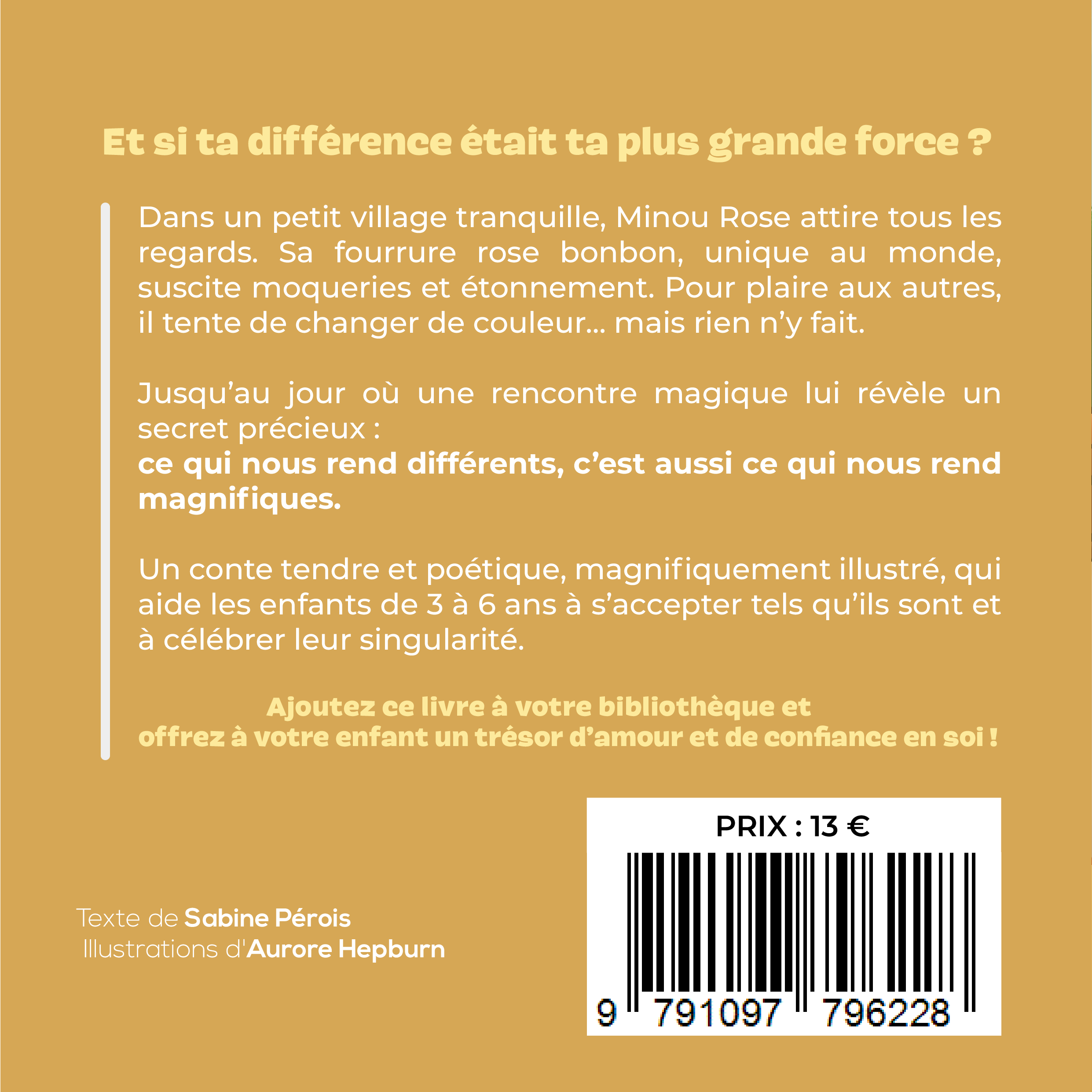 Dans un petit village tranquille, Minou Rose attire tous les regards. Sa fourrure rose bonbon, unique au monde, suscite moqueries et étonnement. Pour plaire aux autres, il tente de changer de couleur… mais rien n’y fait.