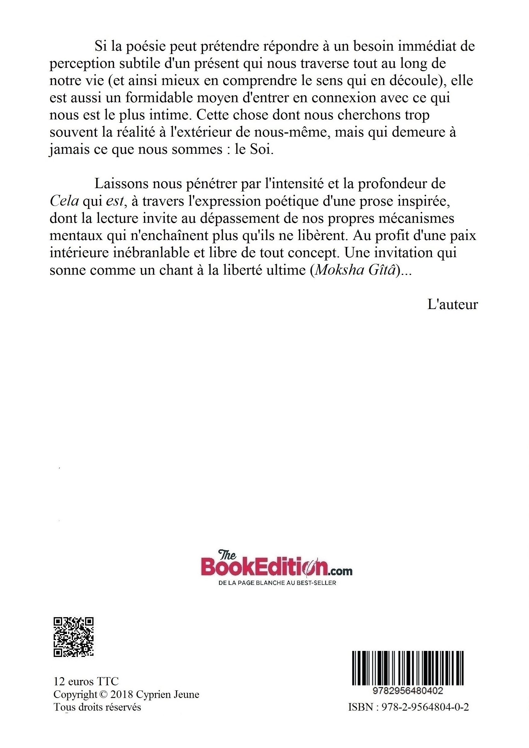 Si la poésie peut prétendre répondre à un besoin immédiat de perception subtile d'un présent qui nous traverse tout au long de notre vie, et ainsi mieux en comprendre le sens qui en découle, elle est aussi un formidable moyen d'entrer en connexion avec ce qui nous est le plus intime et dont nous cherchons trop souvent la réalité à l'extérieur de nous-même : le Soi. Sachons donc nous laisser pénétrer par l'intensité et la profondeur de ce que nous sommes réellement, à travers l'expression poétique d'une prose inspirée dont la lecture invite au dépassement de ses propres mécanismes mentaux, qui n'enchaînent plus qu'ils ne libèrent, au profit d'une paix intérieure inébranlable et libre de tout concept.