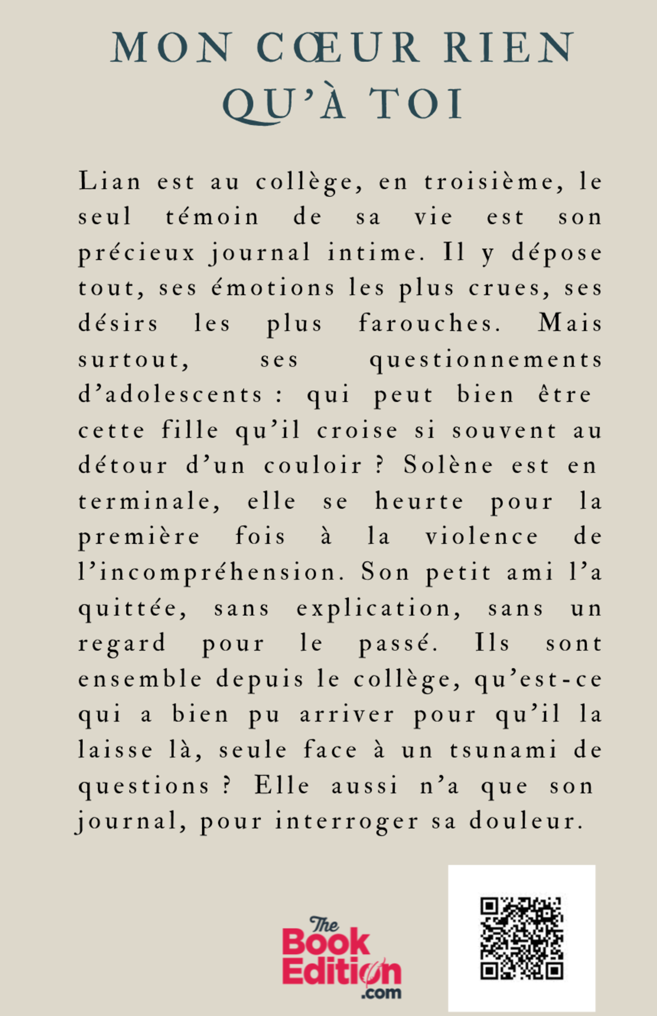Lian est au collège, en troisième, le seul témoin de sa vie est son précieux journal intime. Il y dépose tout, ses émotions les plus crues, ses désirs les plus farouches. Mais surtout, ses questionnements d'adolescents : qui peut bien être cette fille qu'il croise si souvent au détour d'un couloir ? Solène est en terminale, elle se heurte pour la première fois à la violence de l'incompréhension. Son petit ami l'a quittée, sans explication, sans un regard pour le passé. Ils sont ensemble depuis le collège, qu'est-ce qui a bien pu arriver pour qu'il la laisse là, seule face à un tsunami de questions ? Elle aussi n'a que son journal, pour interroger sa douleur.