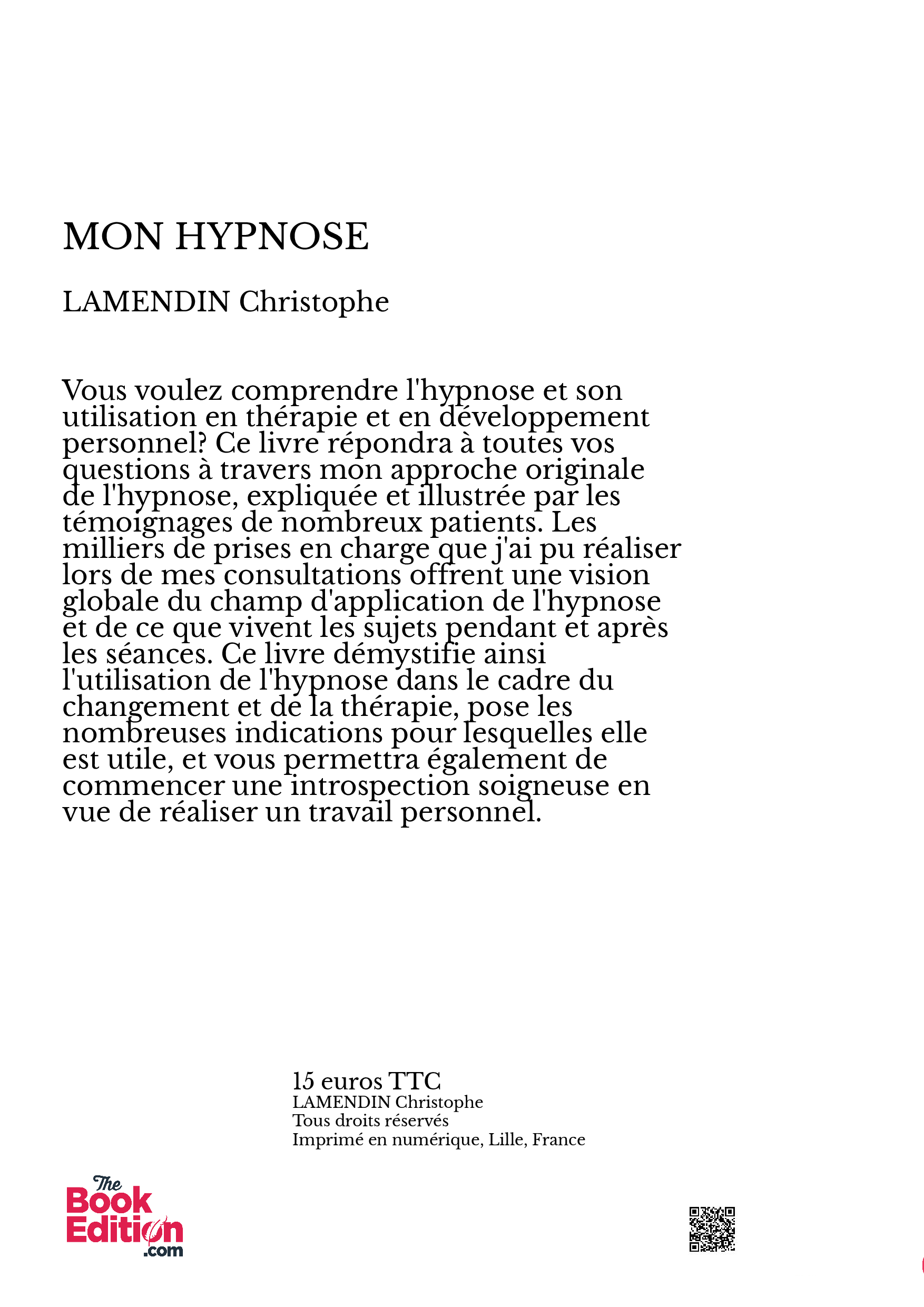 Vous voulez comprendre l'hypnose et son utilisation en thérapie et en développement personnel? Ce livre répondra à toutes vos questions à travers mon approche originale de l'hypnose, expliquée et illustrée par les témoignages de nombreux patients. Les milliers de prises en charge que j'ai pu réaliser lors de mes consultations offrent une vision globale du champ d'application de l'hypnose et de ce que vivent les sujets pendant et après les séances. Ce livre démystifie ainsi l'utilisation de l'hypnose dans le cadre du changement et de la thérapie, pose les nombreuses indications pour lesquelles elle est utile, et vous permettra également de commencer une introspection soigneuse en vue de réaliser un travail personnel.