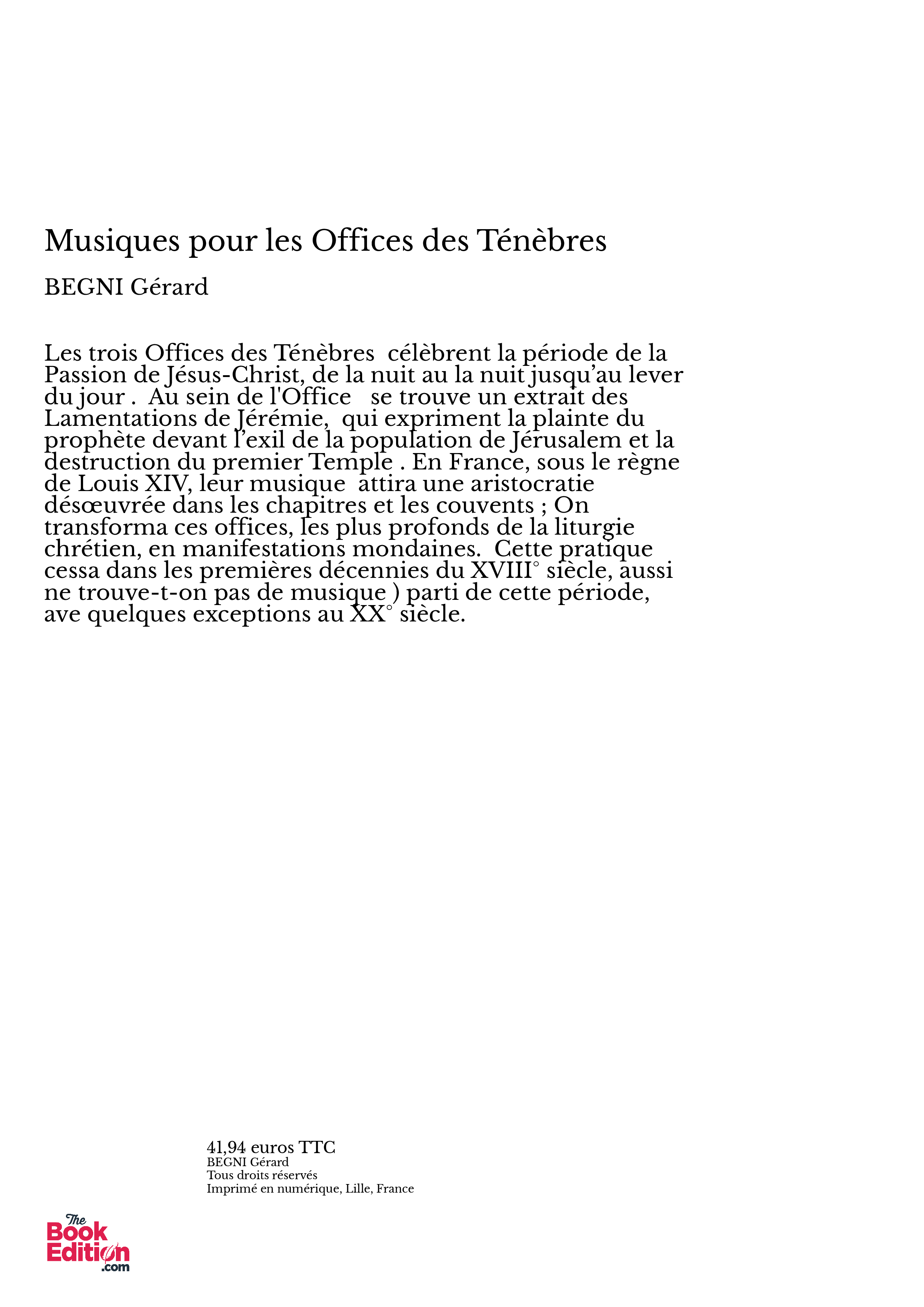 Les trois Offices des Ténèbres célèbrent la période de la Passion de Jésus-Christ, de la nuit au la nuit jusqu’au lever du jour . Au sein de l'Office se trouve un extrait des Lamentations de Jérémie, qui expriment la plainte du prophète devant l’exil de la population de Jérusalem et la destruction du premier Temple . En France, sous le règne de Louis XIV, leur musique attira une aristocratie désœuvrée dans les chapitres et les couvents ; On transforma ces offices, les plus profonds de la liturgie chrétien, en manifestations mondaines. Cette pratique cessa dans les premières décennies du XVIII° siècle, aussi ne trouve-t-on pas de musique ) parti de cette période, ave quelques exceptions au XX° siècle.