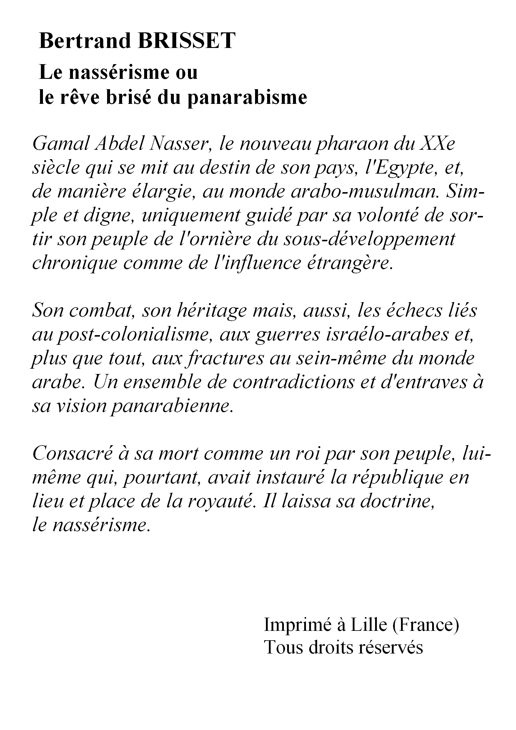 Gamal Abdel Nasser, le nouveau pharaon du XXe siècle qui se mit au service de son pays, l'Egypte, et, de manière élargie, au monde arabo-musulman. Simple et digne, uniquement guidé par la volonté de sortir son peuple de l'ornière du sous-développement chronique comme de l'influence étrangère.