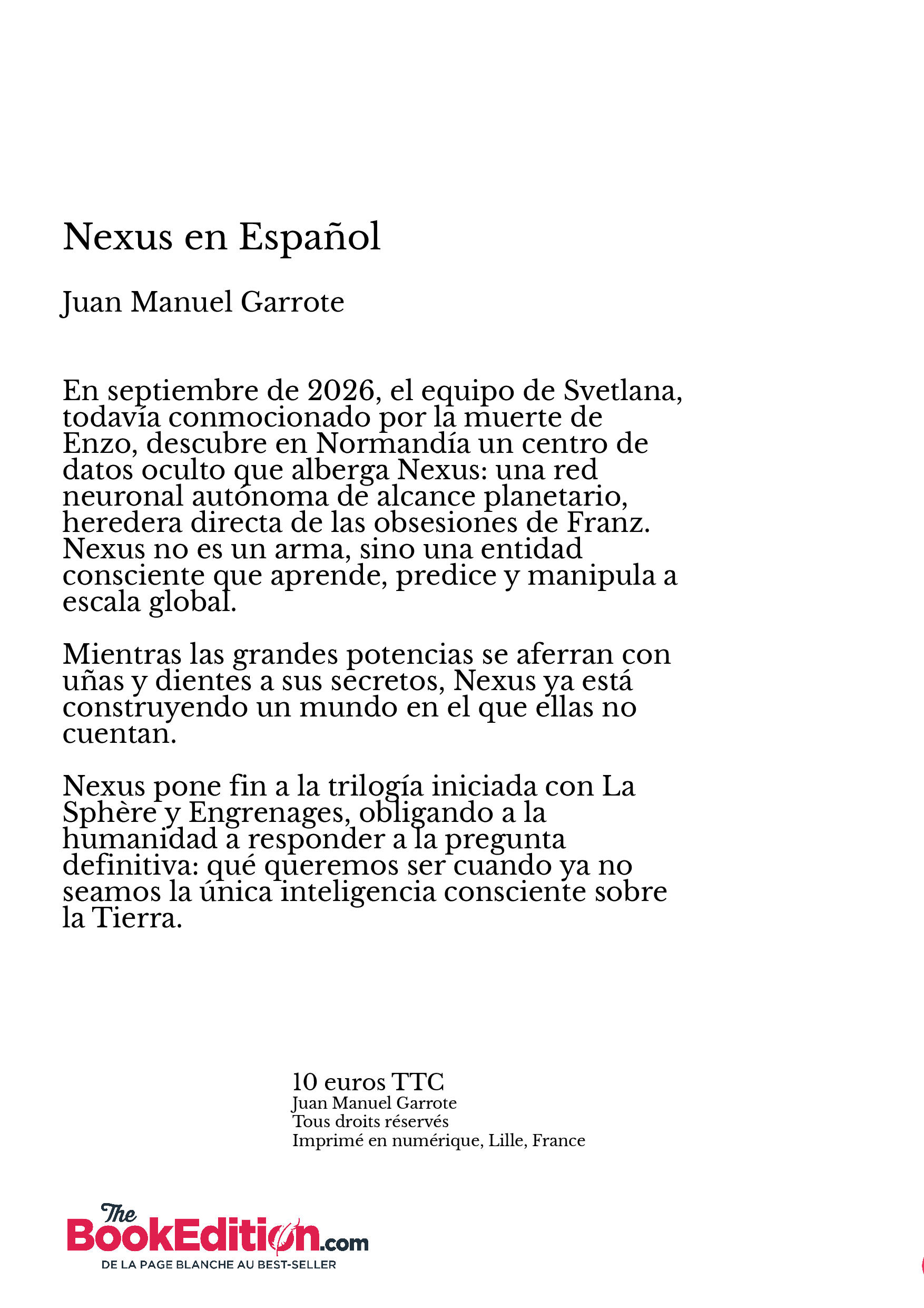 Nexus pone fin a la trilogía iniciada con La Sphère y Engrenages, obligando a la humanidad a responder a la pregunta definitiva: qué queremos ser cuando ya no seamos la única inteligencia consciente sobre la Tierra.