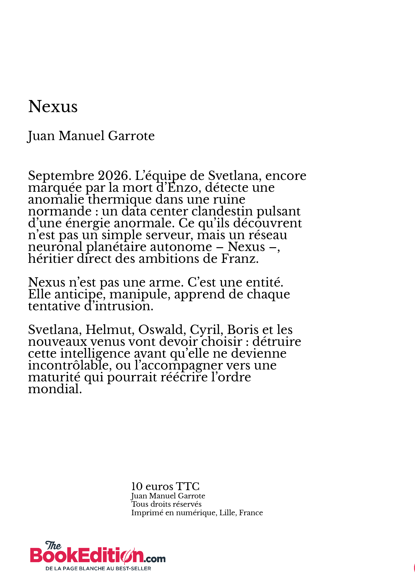 Septembre 2026. L’équipe de Svetlana, encore marquée par la mort d’Enzo, détecte une anomalie thermique dans une ruine normande : un data center clandestin pulsant d’une énergie anormale. Ce qu’ils découvrent n’est pas un simple serveur, mais un réseau neuronal planétaire autonome – Nexus –, héritier direct des ambitions de Franz.