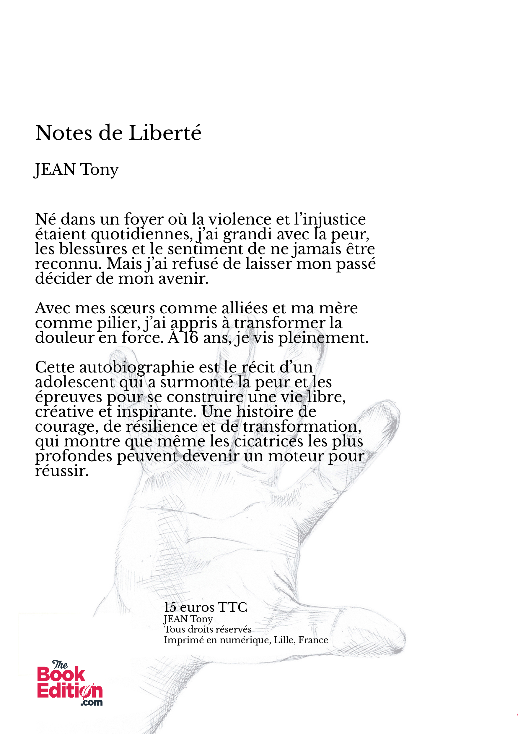 Cette autobiographie est le récit d’un adolescent qui a surmonté la peur et les épreuves pour se construire une vie libre, créative et inspirante. Une histoire de courage, de résilience et de transformation, qui montre que même les cicatrices les plus profondes peuvent devenir un moteur pour réussir.