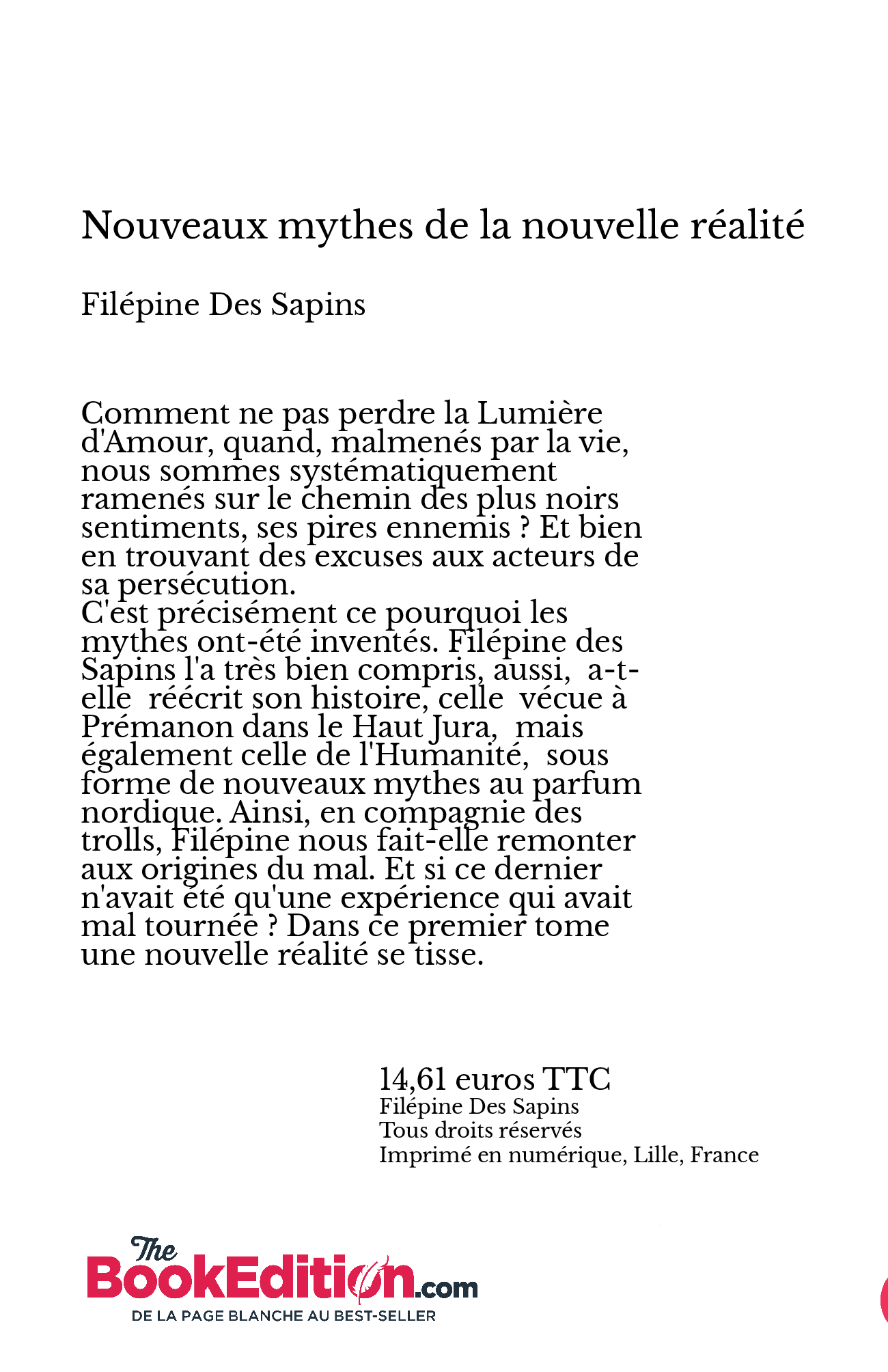 C'est précisément ce pourquoi les mythes ont-été inventés. Filépine des Sapins l'a très bien compris, aussi, a-t-elle réécrit son histoire, celle vécue à Prémanon dans le Haut Jura, mais également celle de l'Humanité, le tout entrelacé sous forme de nouveaux mythes au parfum nordique. Ainsi, en compagnie des trolls, Filépine nous fait-elle remonter aux origines du mal. Et si ce dernier n'avait été qu'une expérience qui avait mal tournée ? Sous vos yeux, une nouvelle réalité nous saisie.