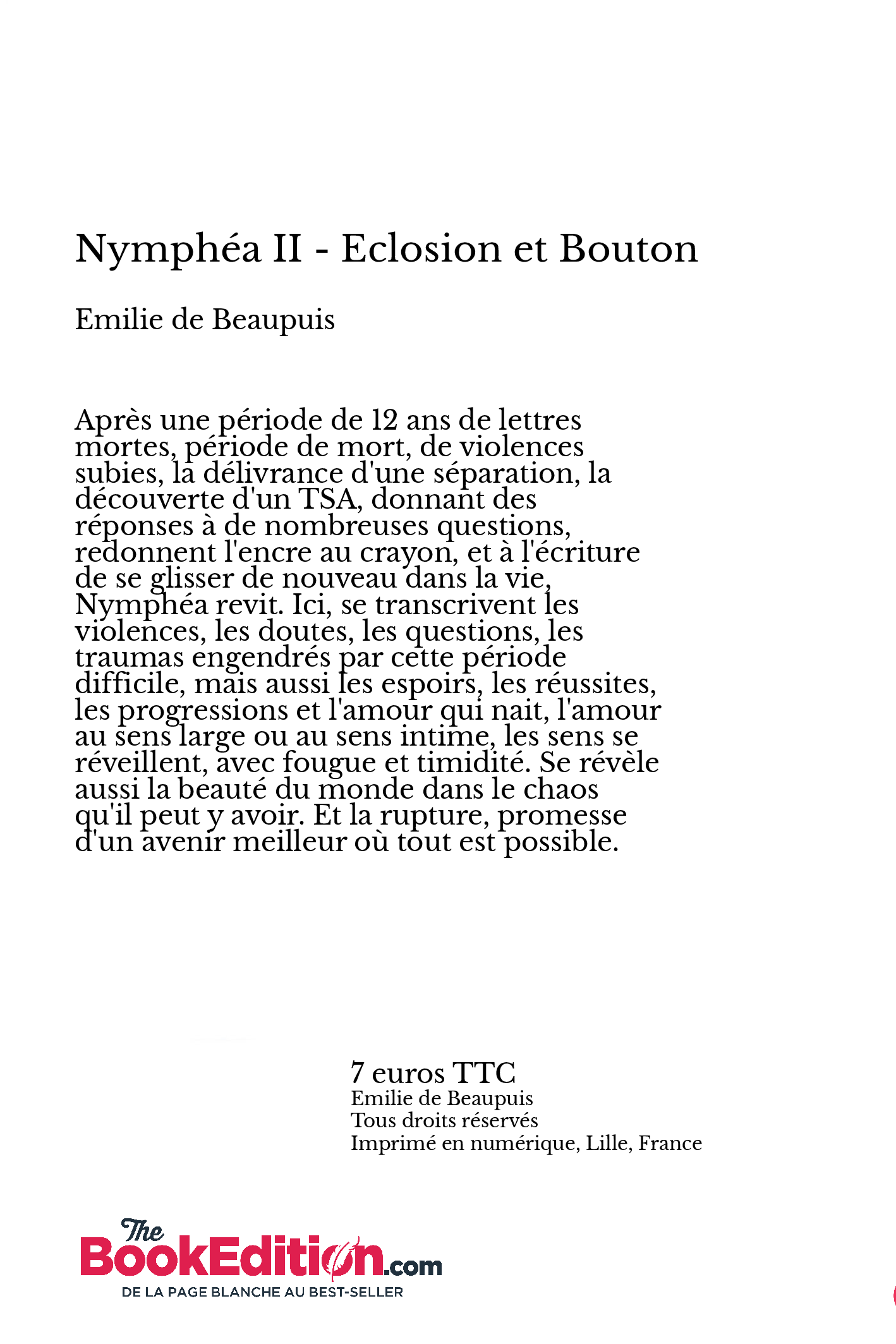 Après une période de 12 ans de lettres mortes, période de mort, de violences subies, la délivrance d'une séparation, la découverte d'un TSA, donnant des réponses à de nombreuses questions, redonnent l'encre au crayon, et à l'écriture de se glisser de nouveau dans la vie, Nymphéa revit. Ici, se transcrive les violences, les doutes, les questions, les traumas qu'a engendré cette période difficile, mais aussi les espoirs, les réussites, les progressions et l'amour qui nait, l'amour au sens large ou au sens intime, les sens se réveillent, avec fougue et timidité aussi. Se révèle aussi la beauté du monde dans le chaos qu'il peut y avoir. Et la rupture, promesse d'un avenir meilleur où tout est possible.