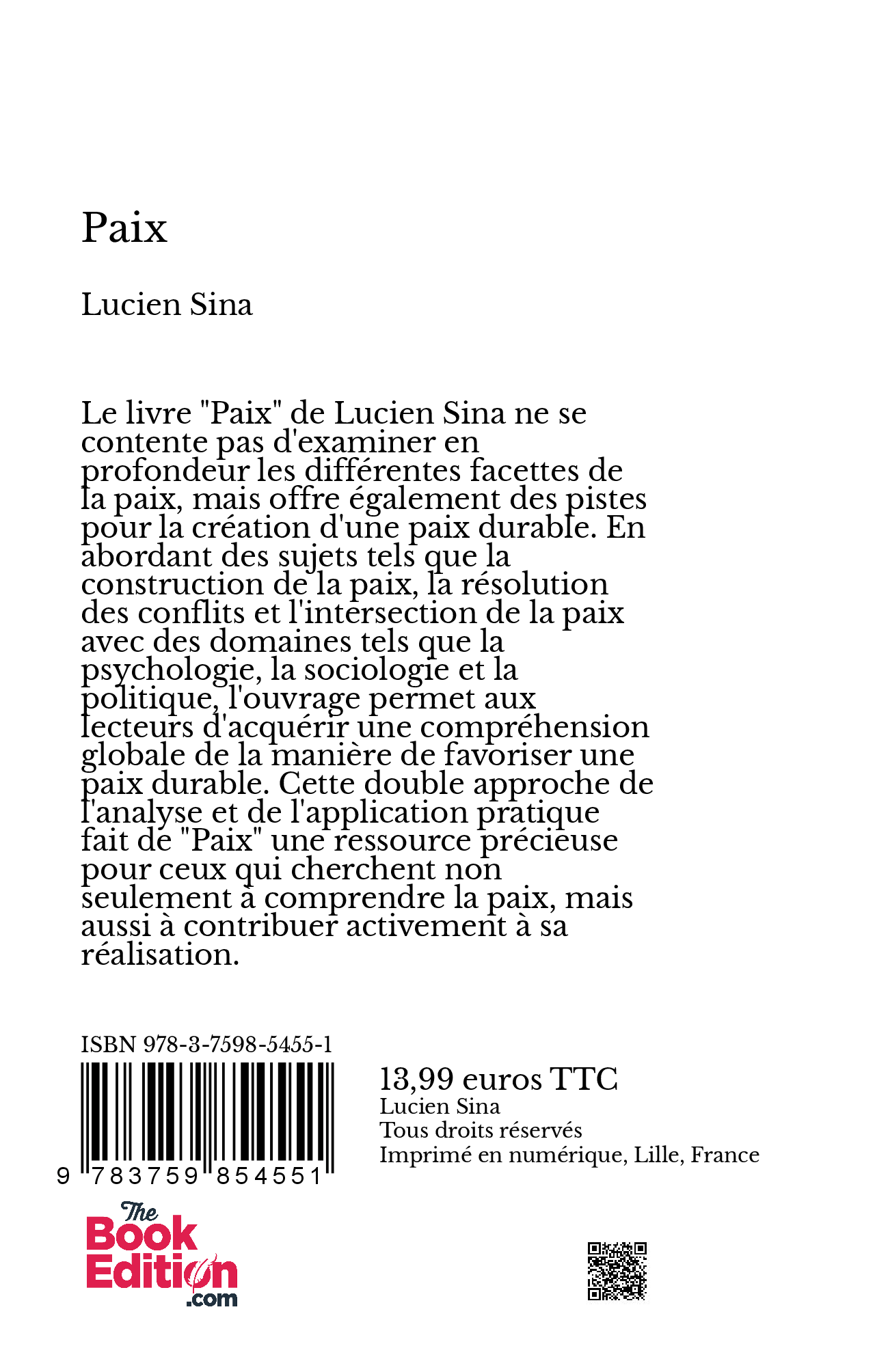 Le livre "Paix" de Lucien Sina ne se contente pas d'examiner en profondeur les différentes facettes de la paix, mais offre également des pistes pour la création d'une paix durable. En abordant des sujets tels que la construction de la paix, la résolution des conflits et l'intersection de la paix avec des domaines tels que la psychologie, la sociologie et la politique, l'ouvrage permet aux lecteurs d'acquérir une compréhension globale de la manière de favoriser une paix durable. Cette double approche de l'analyse et de l'application pratique fait de "Paix" une ressource précieuse pour ceux qui cherchent non seulement à comprendre la paix, mais aussi à contribuer activement à sa réalisation.