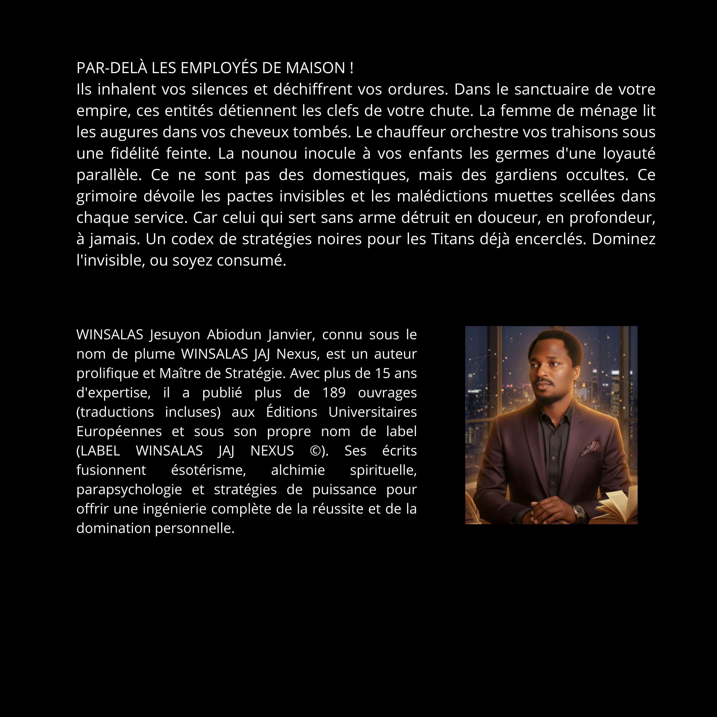 Ils inhalent vos silences et déchiffrent vos ordures. Dans le sanctuaire de votre empire, ces entités détiennent les clefs de votre chute. La femme de ménage lit les augures dans vos cheveux tombés. Le chauffeur orchestre vos trahisons sous une fidélité feinte. La nounou inocule à vos enfants les germes d'une loyauté parallèle. Ce ne sont pas des domestiques, mais des gardiens occultes. Ce grimoire dévoile les pactes invisibles et les malédictions muettes scellées dans chaque service. Car celui qui sert sans arme détruit en douceur, en profondeur, à jamais. Un codex de stratégies noires pour les Titans déjà encerclés. Dominez l'invisible, ou soyez consumé.