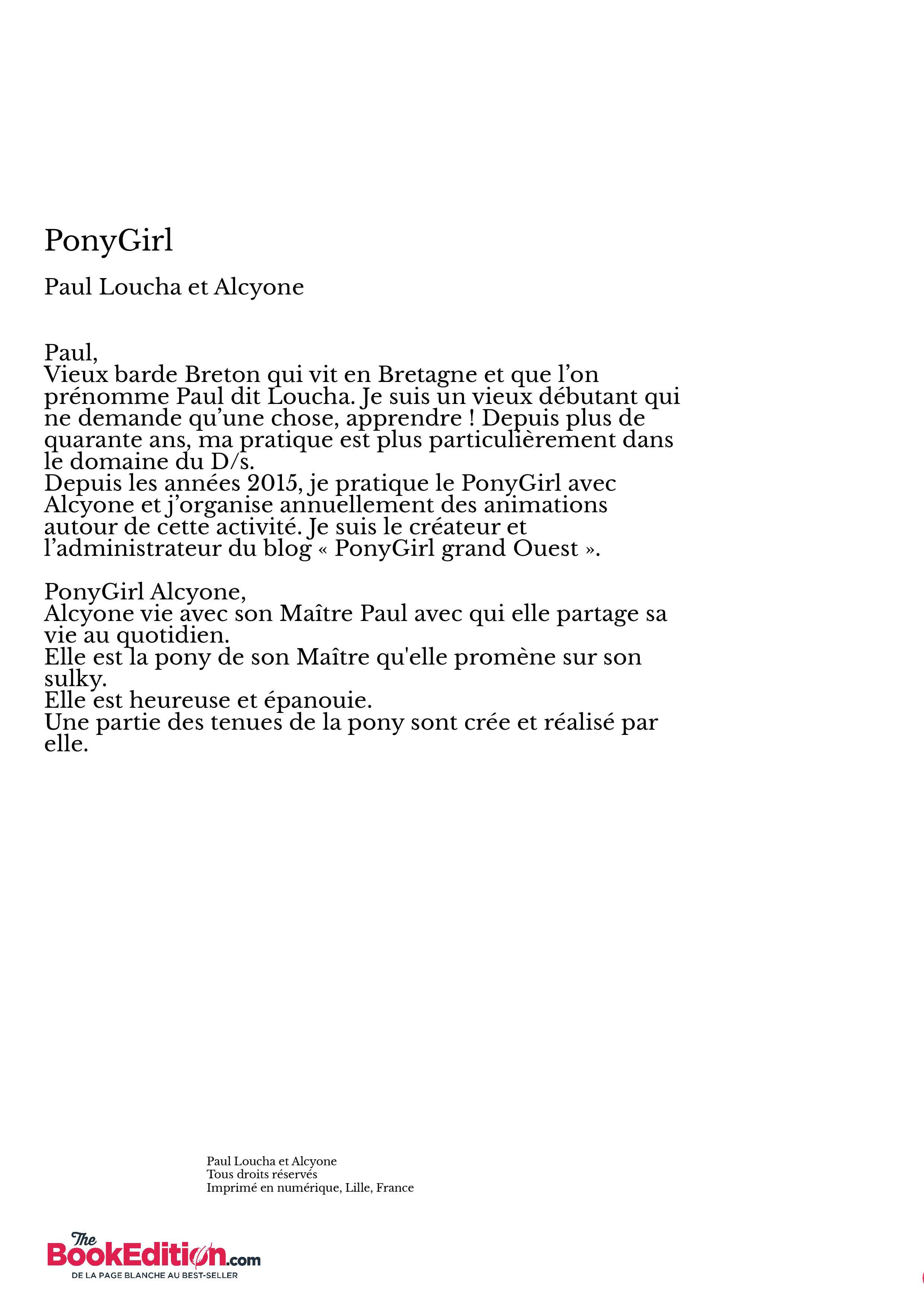 Si le PonyGirl vous intéresse, et si cette aventure vous plaît, ce recueil, vous est destiné. Je vais vous faire partager mon expérience dans ce domaine et vous donner des idées pour réaliser vous aussi votre attelage complet (pony et sulky).