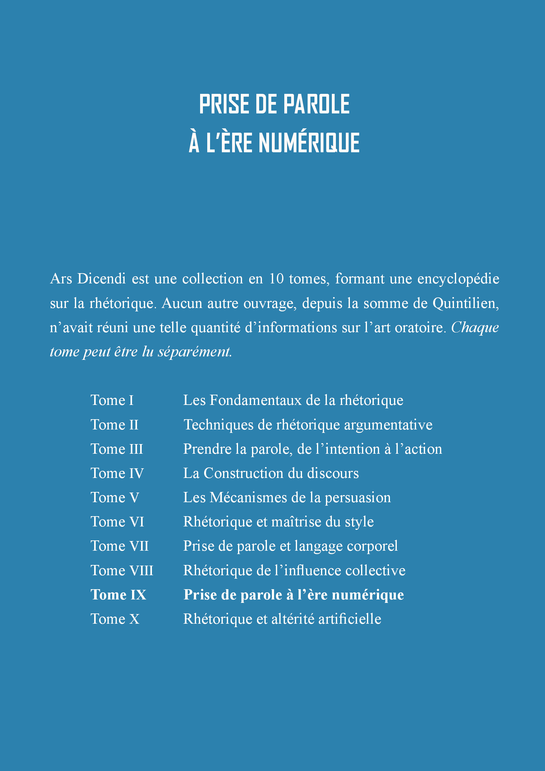 « Prise de parole à l’ère numérique» est le neuvième tome de la collection Ars Dicendi. Chaque tome peut être lu séparément. Les dix tomes de la collection sont en exclusivité sur TheBookEdition, facilement reconnaissables à leurs couvertures bleues. Il faut remonter à Quintilien, au 1ᵉʳ siècle de notre ère, pour trouver une telle collection sur la rhétorique.