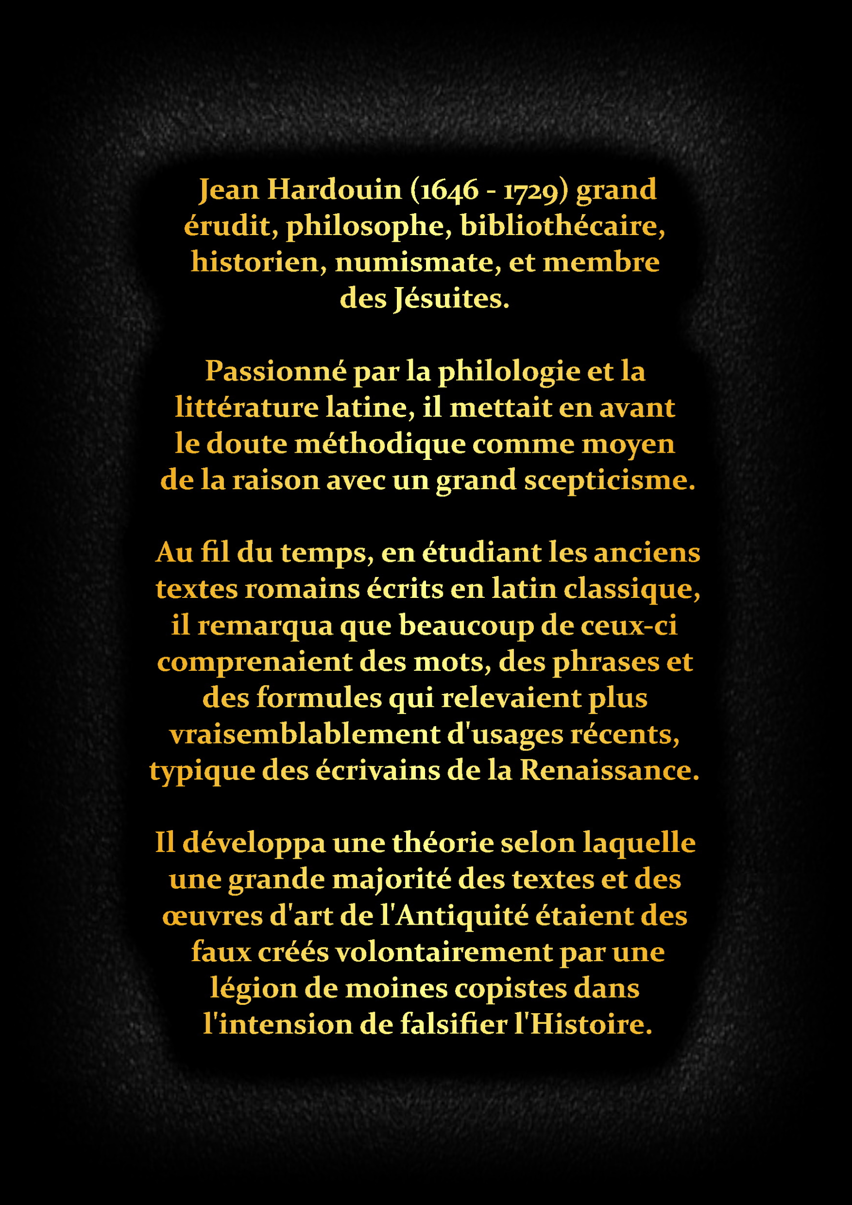 Jean Hardouin (1646 - 1729) grand érudit, philosophe, bibliothécaire, historien, numismate, et membre des Jésuites. Passionné par la