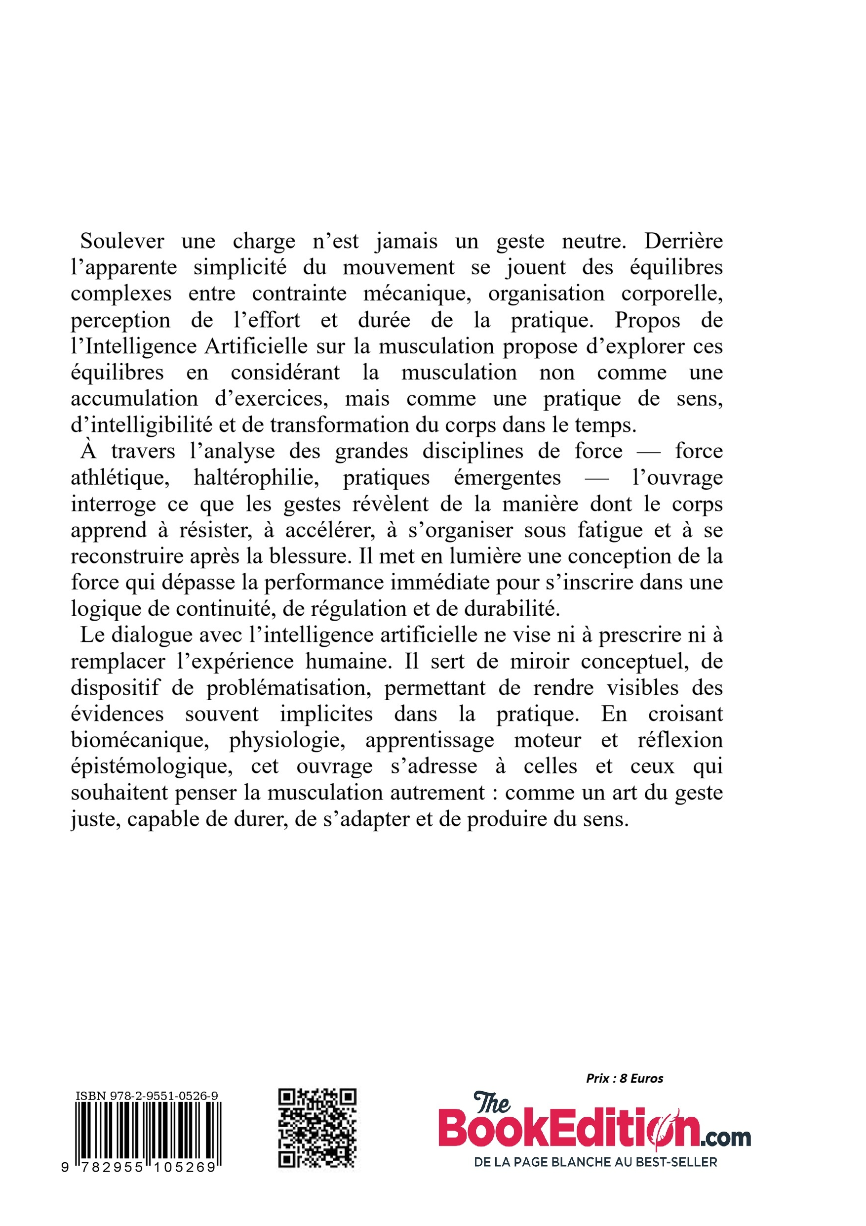 Propos de l’IA sur la musculation propose une réflexion approfondie sur la musculation envisagée comme une pratique d’intelligibilité du geste, de l’adaptation corporelle et de la durée. À travers l’analyse des grandes disciplines de force et des conditions de durabilité de la pratique, l’ouvrage interroge la manière dont le corps organise la contrainte, produit la force et préserve sa cohérence dans le temps. Le dialogue avec l’intelligence artificielle sert ici d’outil de clarification conceptuelle, au service d’une compréhension plus fine, plus consciente et plus soutenable du mouvement humain sous charge.