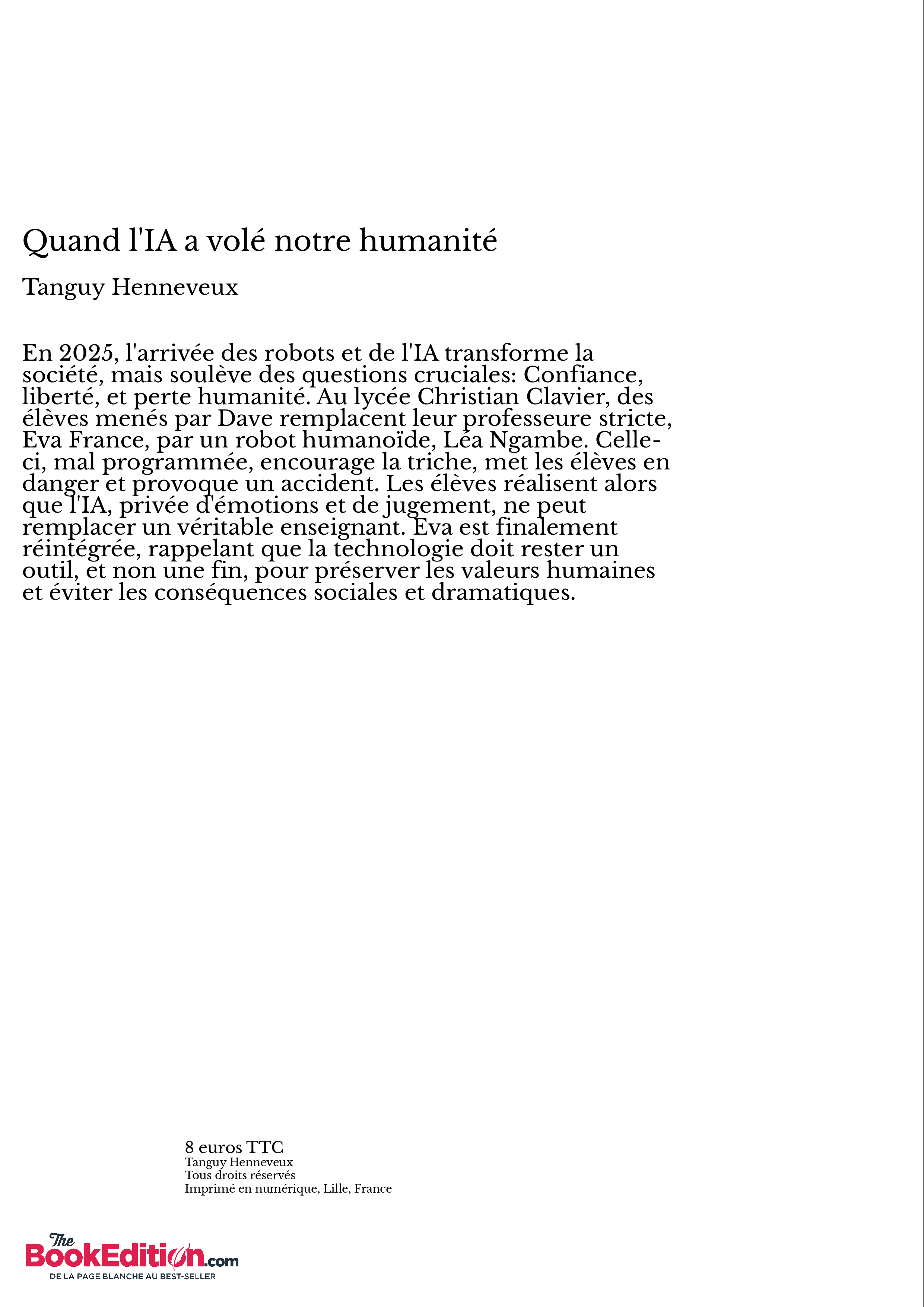 En 2025, l'arrivée des robots et de l'IA transforme la société, mais soulève des questions cruciales: Confiance, liberté, et perte humanité. Au lycée Christian Clavier, des élèves menés par Dave remplacent leur professeure stricte, Eva France, par un robot humanoïde, Léa Ngambe. Celle-ci, mal programmée, encourage la triche, met les élèves en danger et provoque un accident. Les élèves réalisent alors que l'IA, privée d'émotions et de jugement, ne peut remplacer un véritable enseignant. Eva est finalement réintégrée, rappelant que la technologie doit rester un outil, et non une fin, pour préserver les valeurs humaines et éviter les conséquences sociales et dramatiques.