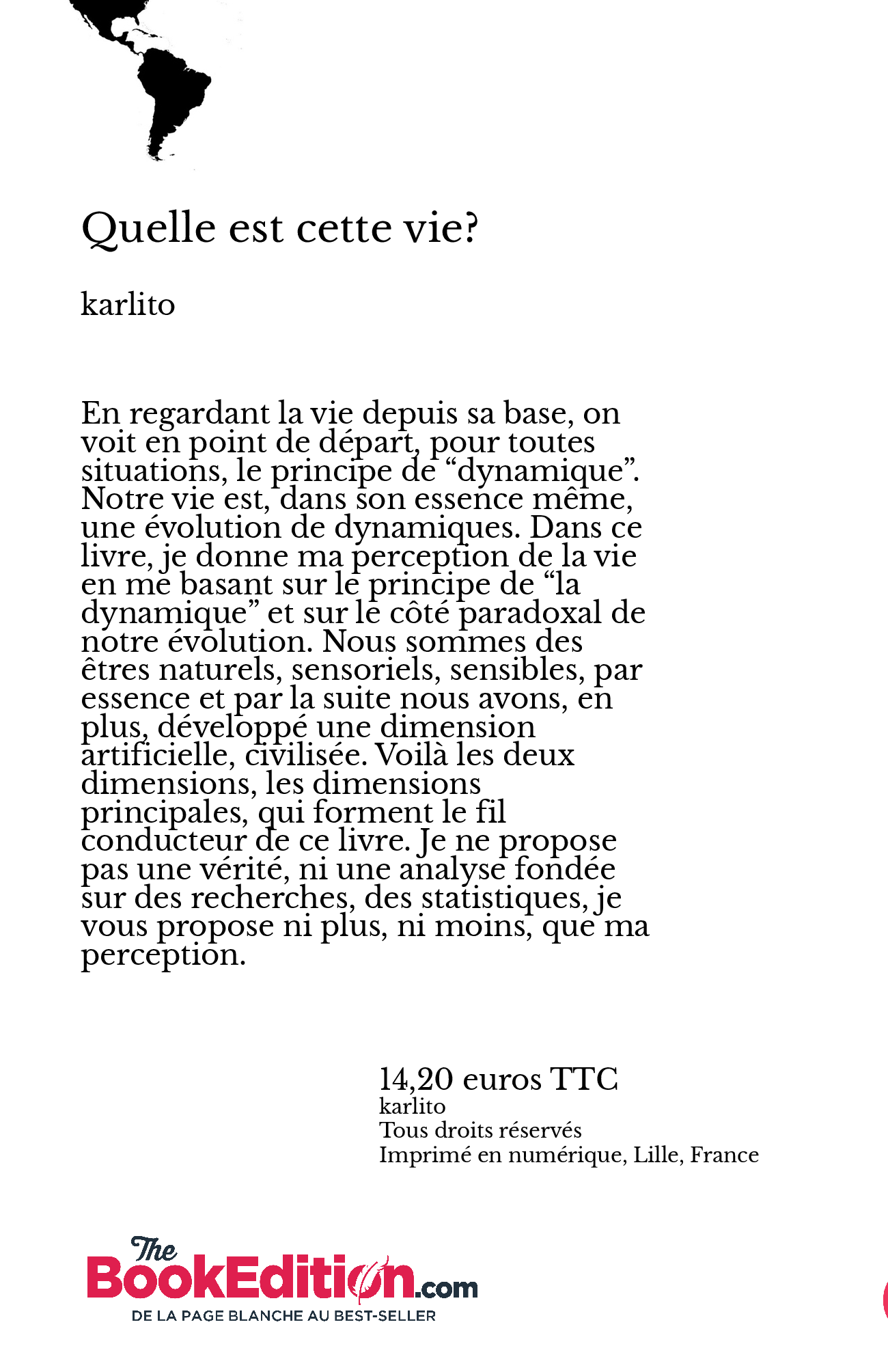 En regardant la vie depuis sa base, on voit en point de départ, pour toutes situations, le principe de “dynamique”. Notre vie est, dans son essence même, une évolution de dynamiques. Dans ce livre, je donne ma perception de la vie en me basant sur le principe de “la dynamique” et sur le côté paradoxal de notre évolution. Nous sommes des êtres naturels, sensoriels, sensibles, par essence et par la suite nous avons, en plus, développé une dimension civilisée, artificielle. Voilà les deux dimensions, les dimensions principales, qui forment le fil conducteur de ce livre. Je ne propose pas une vérité, ni une analyse fondée sur des recherches, des statistiques, je vous propose ni plus, ni moins, que ma perception.