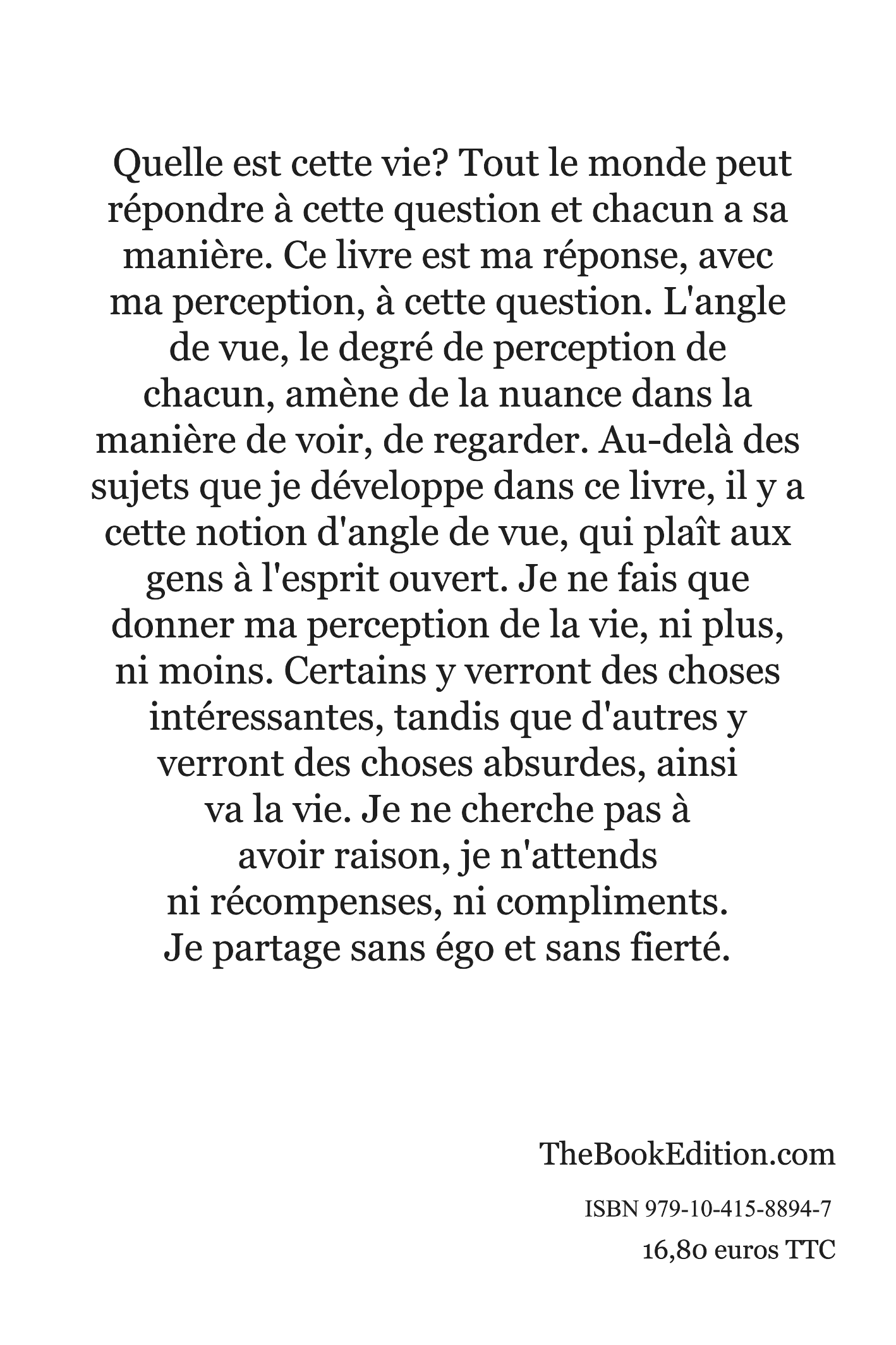Quelle est cette vie? Tout le monde peut répondre à cette question et chacun a sa manière. Ce livre est ma réponse, avecma perception, à cette question. L'angle de vue, le degré de perception de chacun, amène de la nuance dans la manière de voir, de regarder. Au-delà des sujets que je développe dans ce livre, il y a cette notion d'angle de vue, qui plaît aux gens à l'esprit ouvert. Je ne fais que donner ma perception de la vie, ni plus,