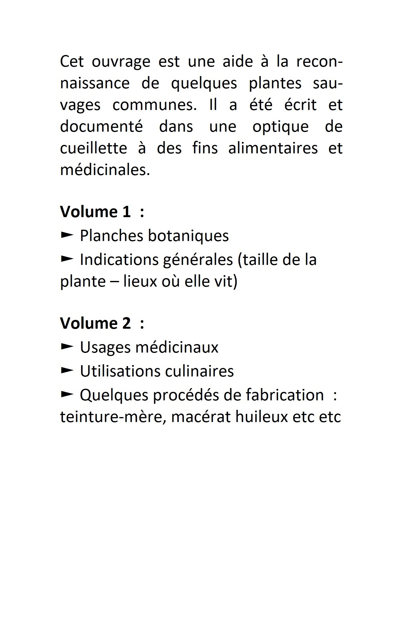 Cet ouvrage est une aide à la reconnaissance de quelques plantes sauvages communes. Il a été écrit et documenté dans une optique de cueillette à des fins alimentaires et médicinales.