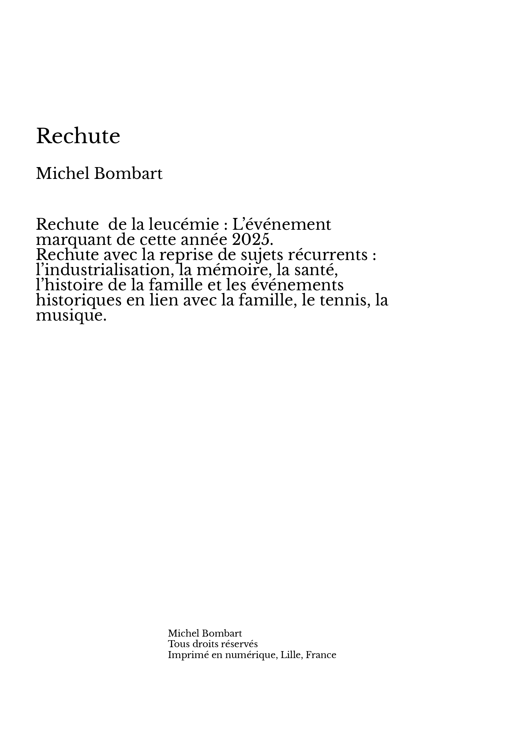 Rechute de la leucémie : L’événement marquant de cette année 2025. Rechute avec la reprise de sujets récurrents : l’industrialisation, la mémoire, la santé, l’histoire de la famille et les événements historiques en lien avec la famille, le tennis, la musique.