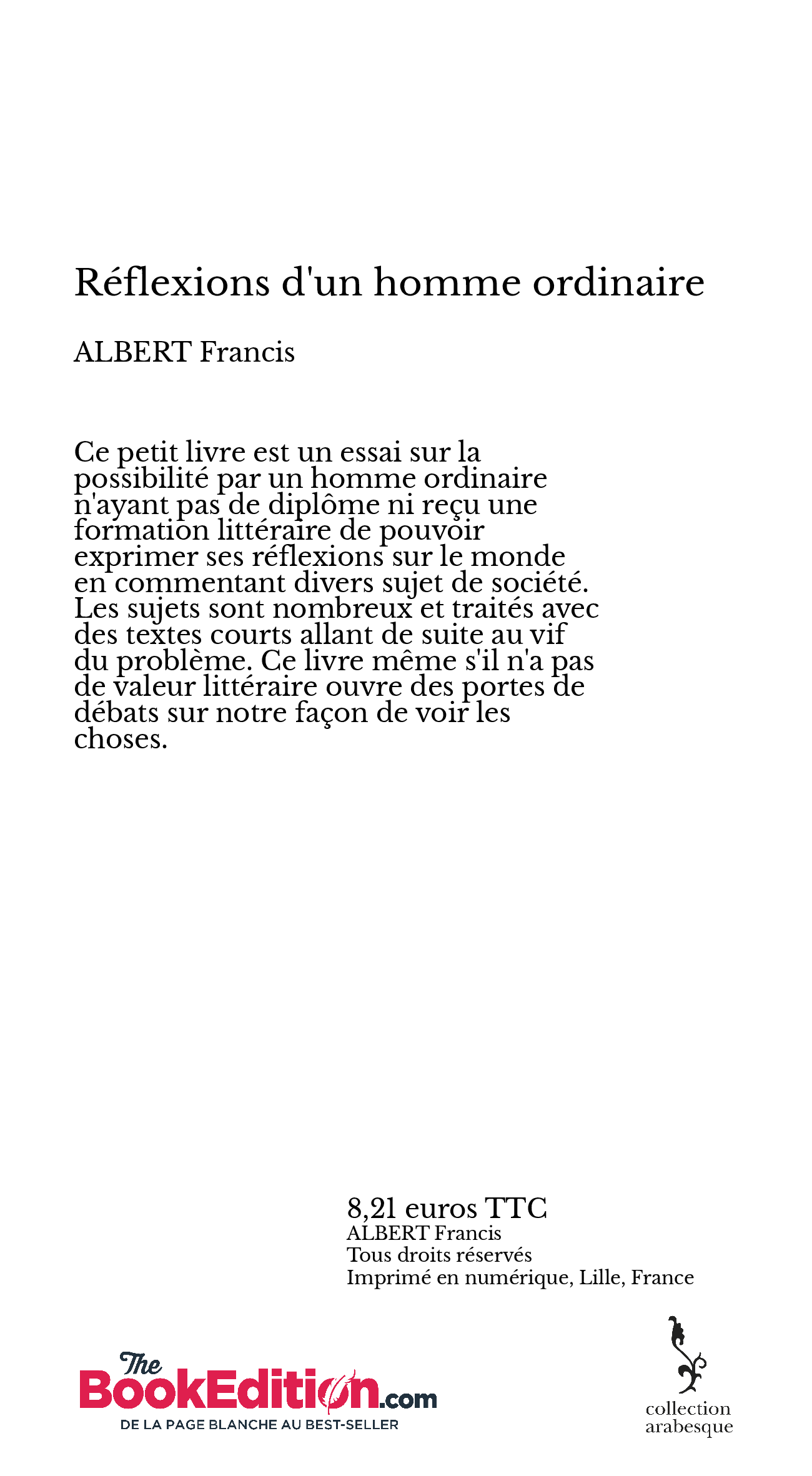 Ce petit livre est un essai sur la possiblité par un homme ordinaire n'ayant pas de diplôme ni reçu une fomation littéraire de pouvoir exprimer ses réflexions sur le monde en commentant divers sujet de socièté. Les sujets sont nombreux et traités avec des textes courts allant de suite au vif du problème. Ce livre même s'il n'a pas de valeur littéraire ouvre des portes de débats sur notre façon de voir les choses.
