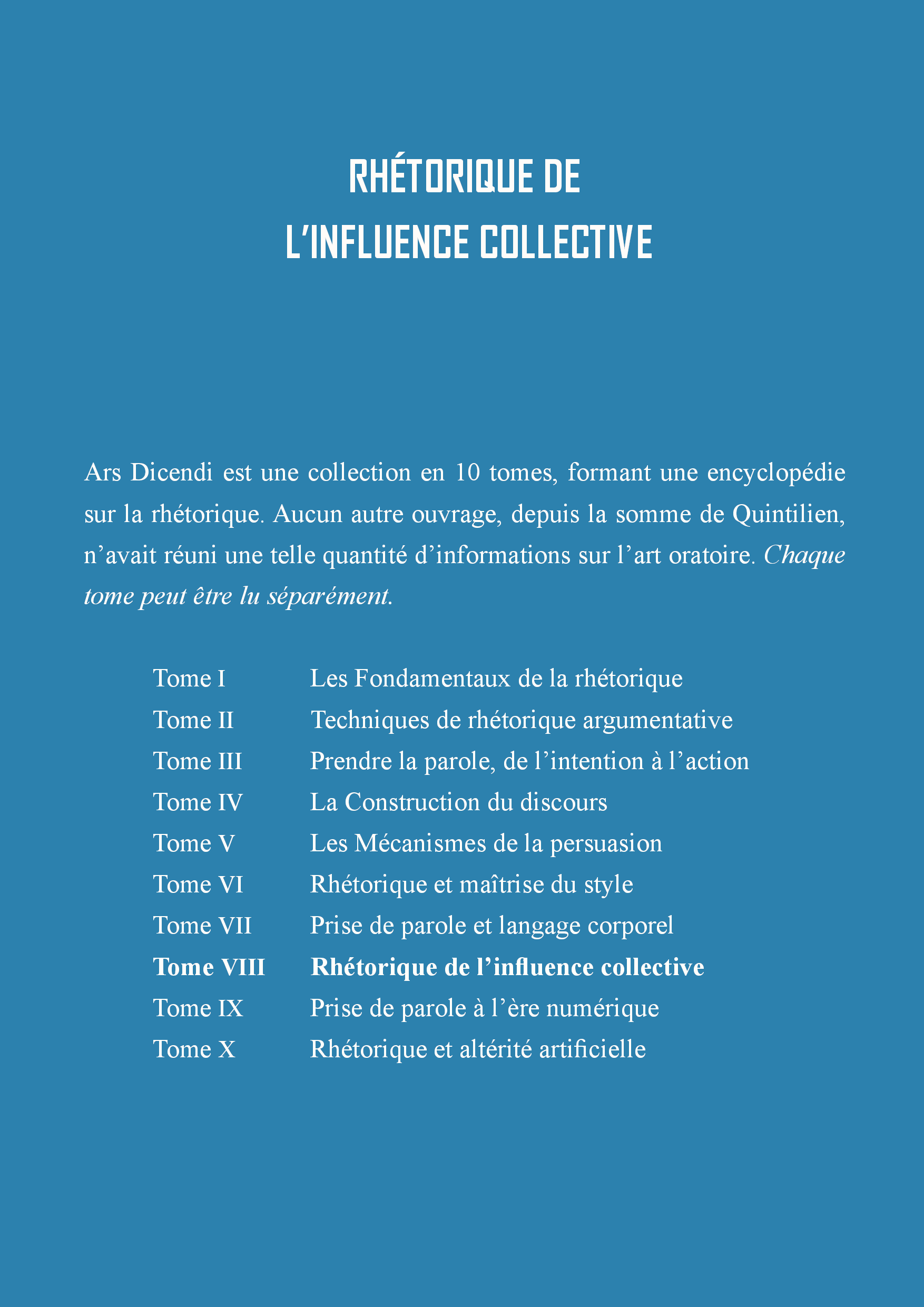 « Rhétorique de l’influence collective » est le huitième tome de la collection Ars Dicendi. Chaque tome peut être lu séparément. Les dix tomes de la collection sont en exclusivité sur TheBookEdition, facilement reconnaissables à leurs couvertures bleues. Il faut remonter à Quintilien, au 1ᵉʳ siècle de notre ère, pour trouver une telle collection sur la rhétorique.