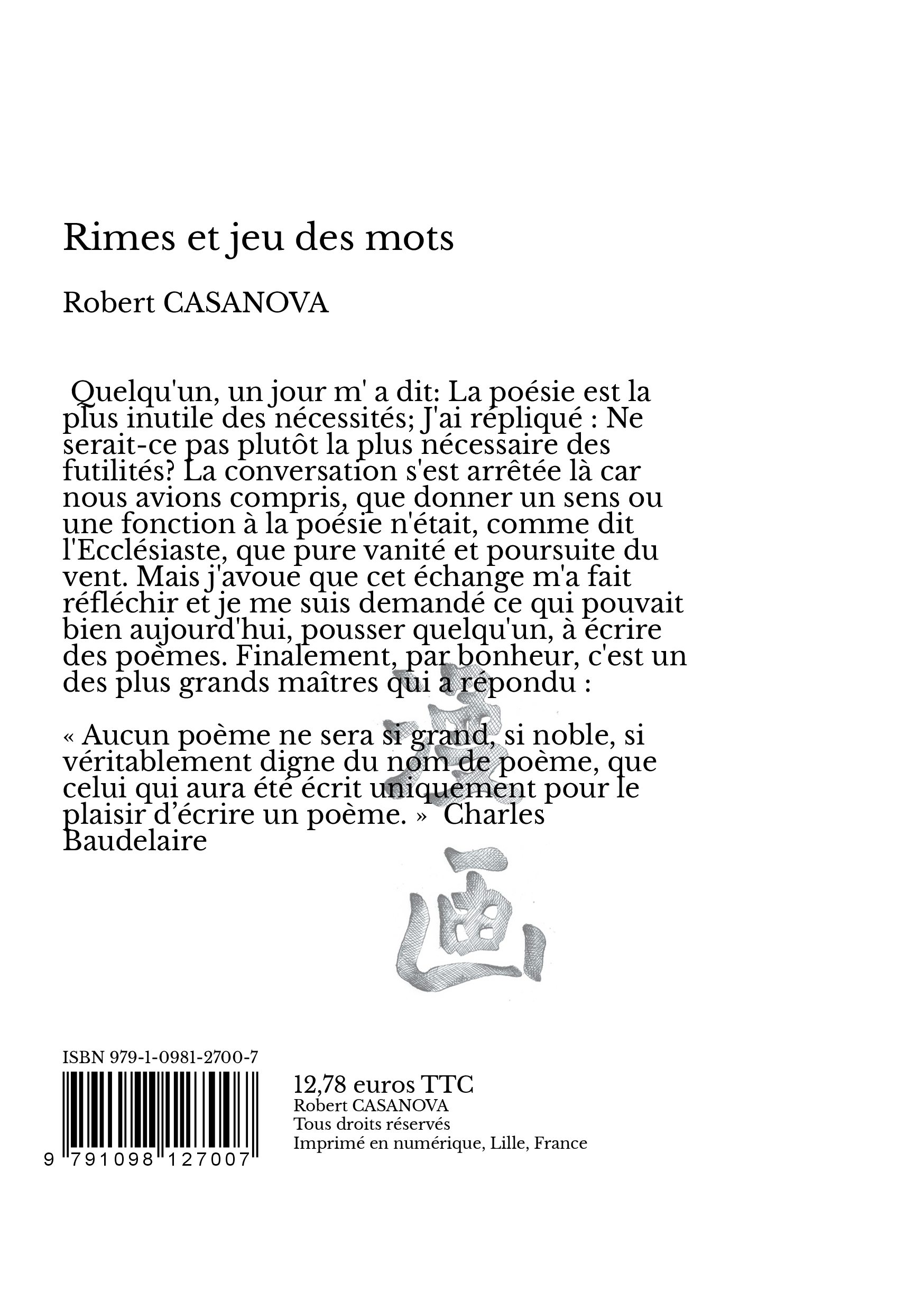 « Aucun poème ne sera si grand, si noble, si véritablement digne du nom de poème, que celui qui aura été écrit uniquement pour le plaisir d’écrire un poème. » Charles Baudelaire