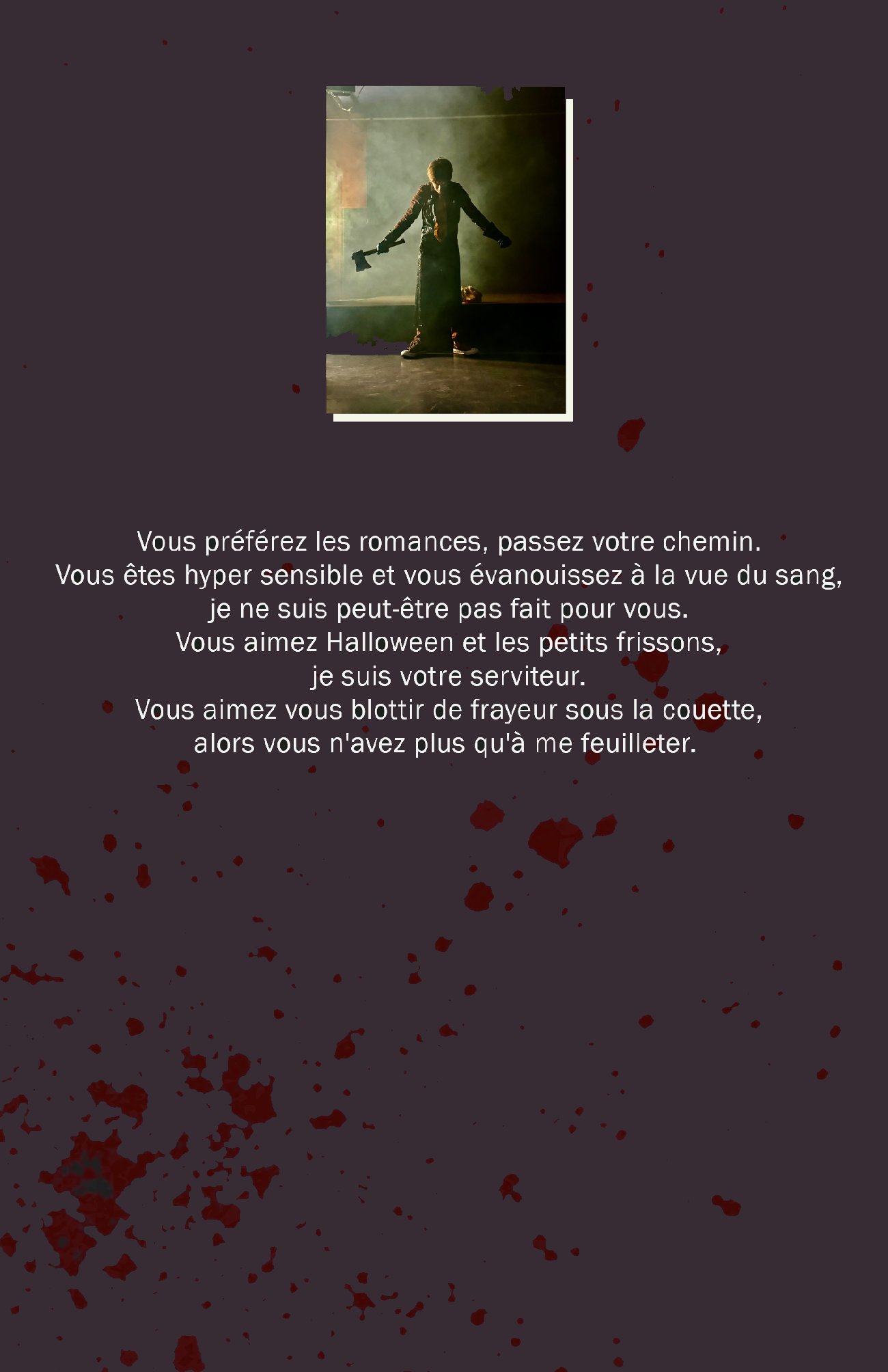 Vous préférez les romances, passez votre chemin. Vous êtes hyper sensible et vous évanouissez à la vue du sang, je ne suis peut être pas fait pour vous. Vous aimez Halloween et les petits frissons, je suis votre serviteur. Vous aimez vous blottir de frayeur sous la couette, alors vous n'avez plus qu'à me feuilleter.