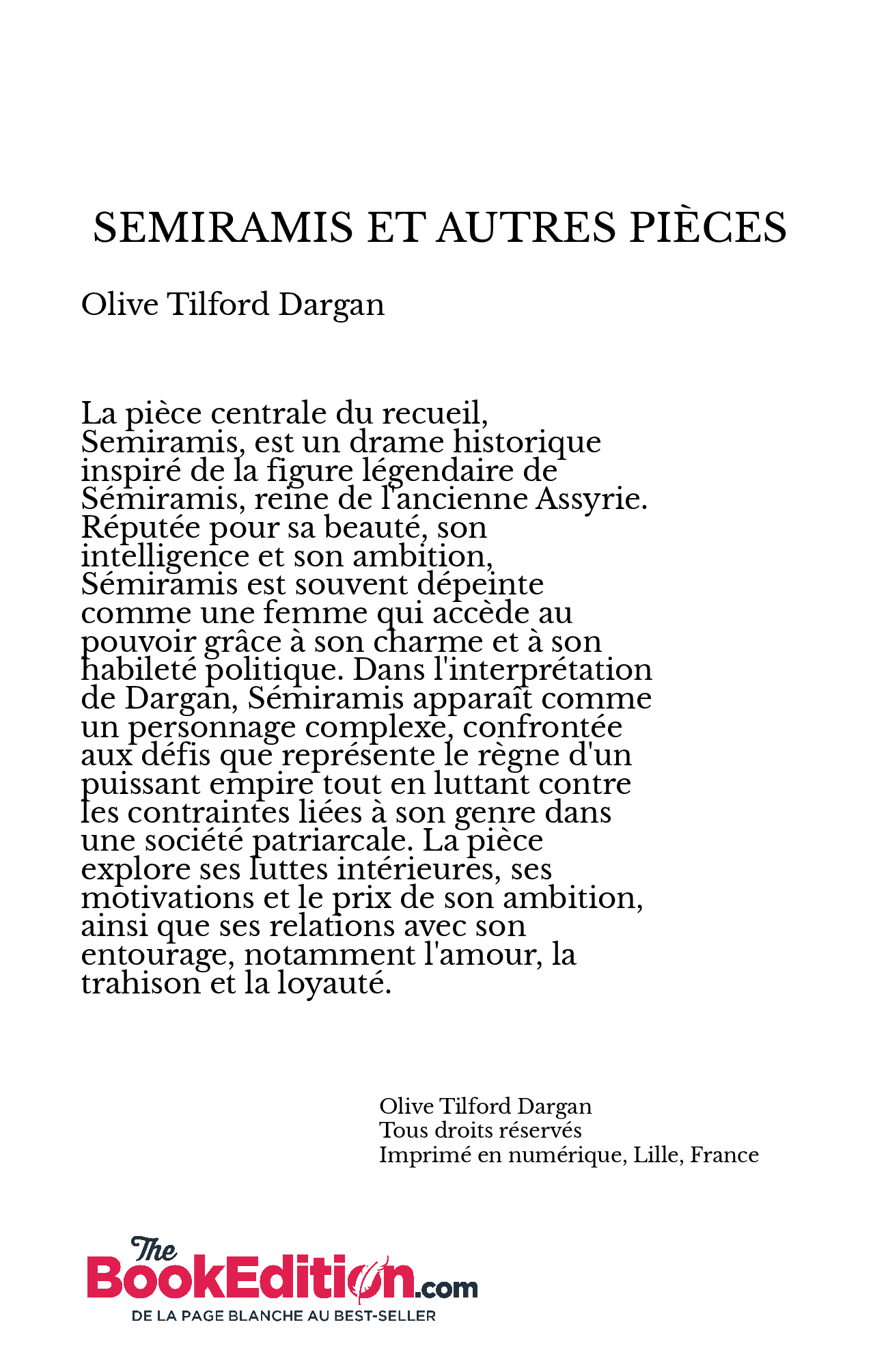 La pièce centrale du recueil, Semiramis, est un drame historique inspiré de la figure légendaire de Sémiramis, reine de l'ancienne Assyrie. Réputée pour sa beauté, son intelligence et son ambition, Sémiramis est souvent dépeinte comme une femme qui accède au pouvoir grâce à son charme et à son habileté politique. Dans l'interprétation de Dargan, Sémiramis apparaît comme un personnage complexe, confrontée aux défis que représente le règne d'un puissant empire tout en luttant contre les contraintes liées à son genre dans une société patriarcale. La pièce explore ses luttes intérieures, ses motivations et le prix de son ambition, ainsi que ses relations avec son entourage, notamment l'amour, la trahison et la loyauté.