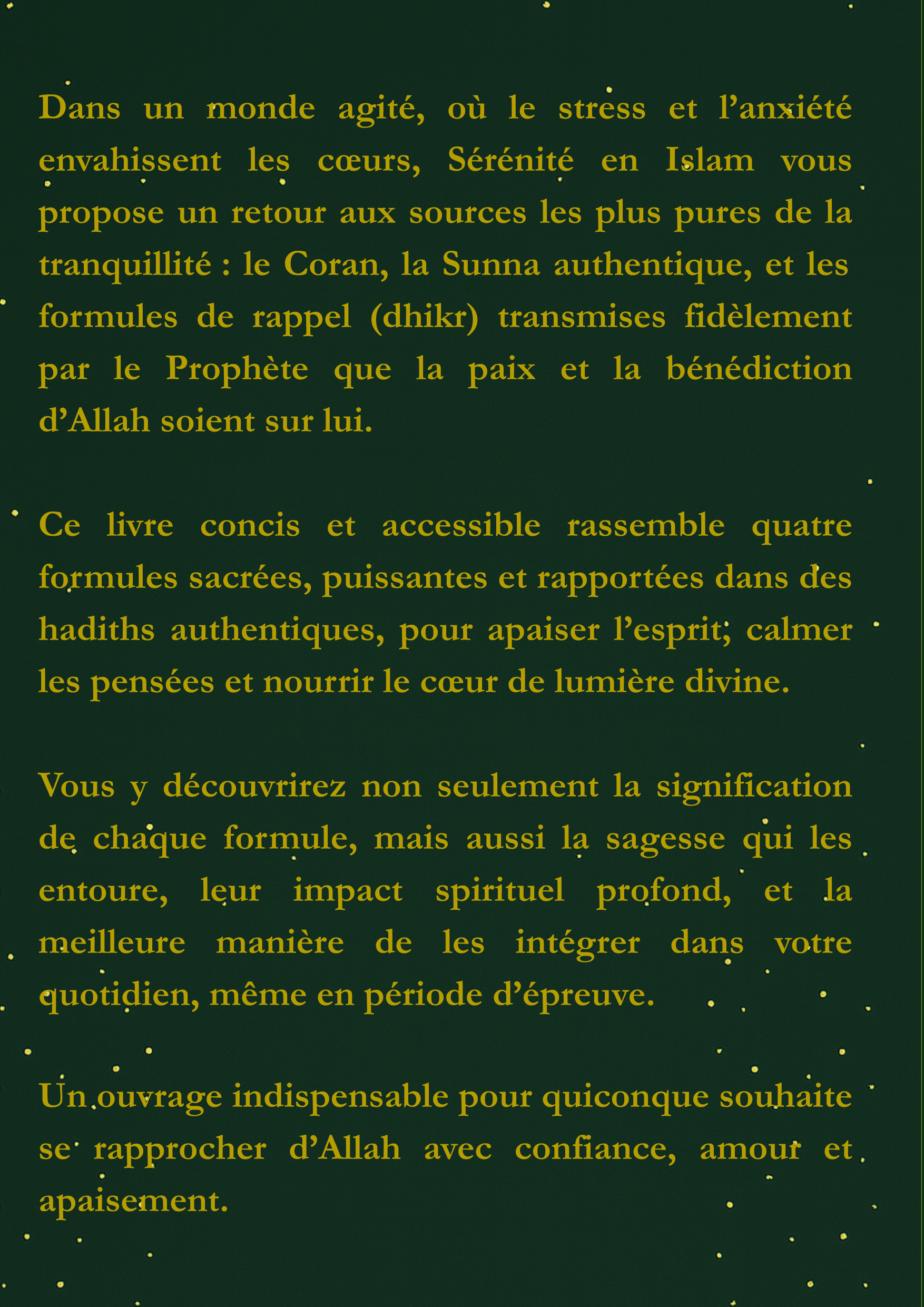 À travers Sérénité en Islam, l’auteur Abou Chayma nous invite à redécouvrir quatre formules sacrées issues des sources authentiques de l’Islam. Simples à prononcer, mais puissantes dans leurs effets, elles permettent d’apaiser l’esprit, d’alléger le cœur et de retrouver une véritable sérénité intérieure.