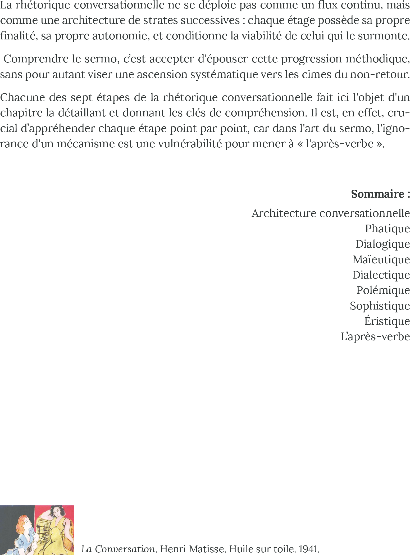 Chacune des sept étapes de la rhétorique conversationnelle fait ici l'objet d'un chapitre la détaillant et donnant les clés de compréhension. Il est, en effet, crucial d’appréhender chaque étape point par point, car dans l'art du sermo, l'ignorance d'un mécanisme est une vulnérabilité pour mener à « l'après-verbe ».