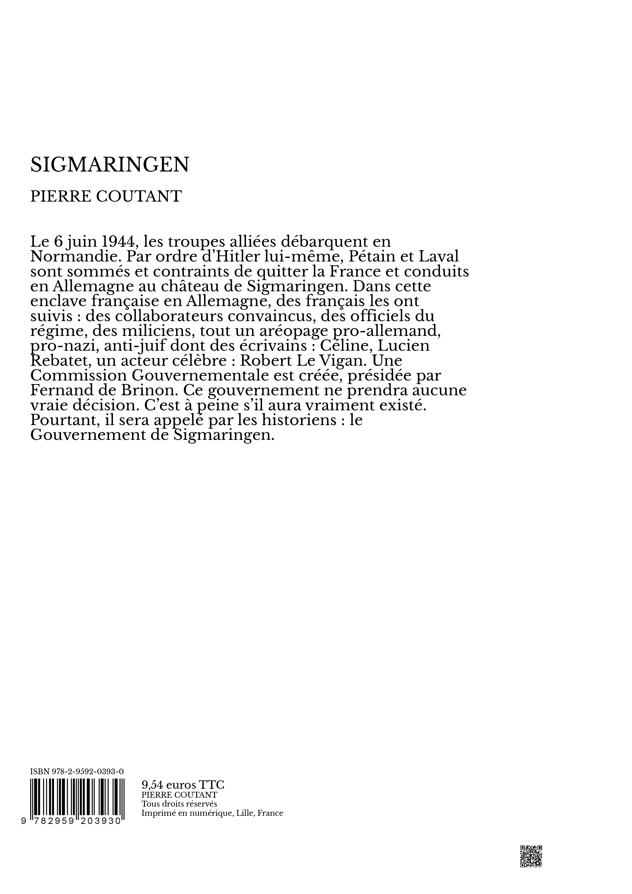 Le 6 juin 1944, les troupes alliées débarquent en Normandie. Par ordre d’Hitler lui-même, Pétain et Laval sont sommés et contraints de quitter la France et conduits en Allemagne au château de Sigmaringen. Dans cette enclave française en Allemagne, des français les ont suivis : des collaborateurs convaincus, des officiels du régime, des miliciens, tout un aréopage pro-allemand, pro-nazi, anti-juif dont des écrivains : Céline, Lucien Rebatet, un acteur célèbre : Robert Le Vigan. Une Commission Gouvernementale est créée, présidée par Fernand de Brinon. Ce gouvernement ne prendra aucune vraie décision. C’est à peine s’il aura vraiment existé. Pourtant, il sera appelé par les historiens : le Gouvernement de Sigmaringen.