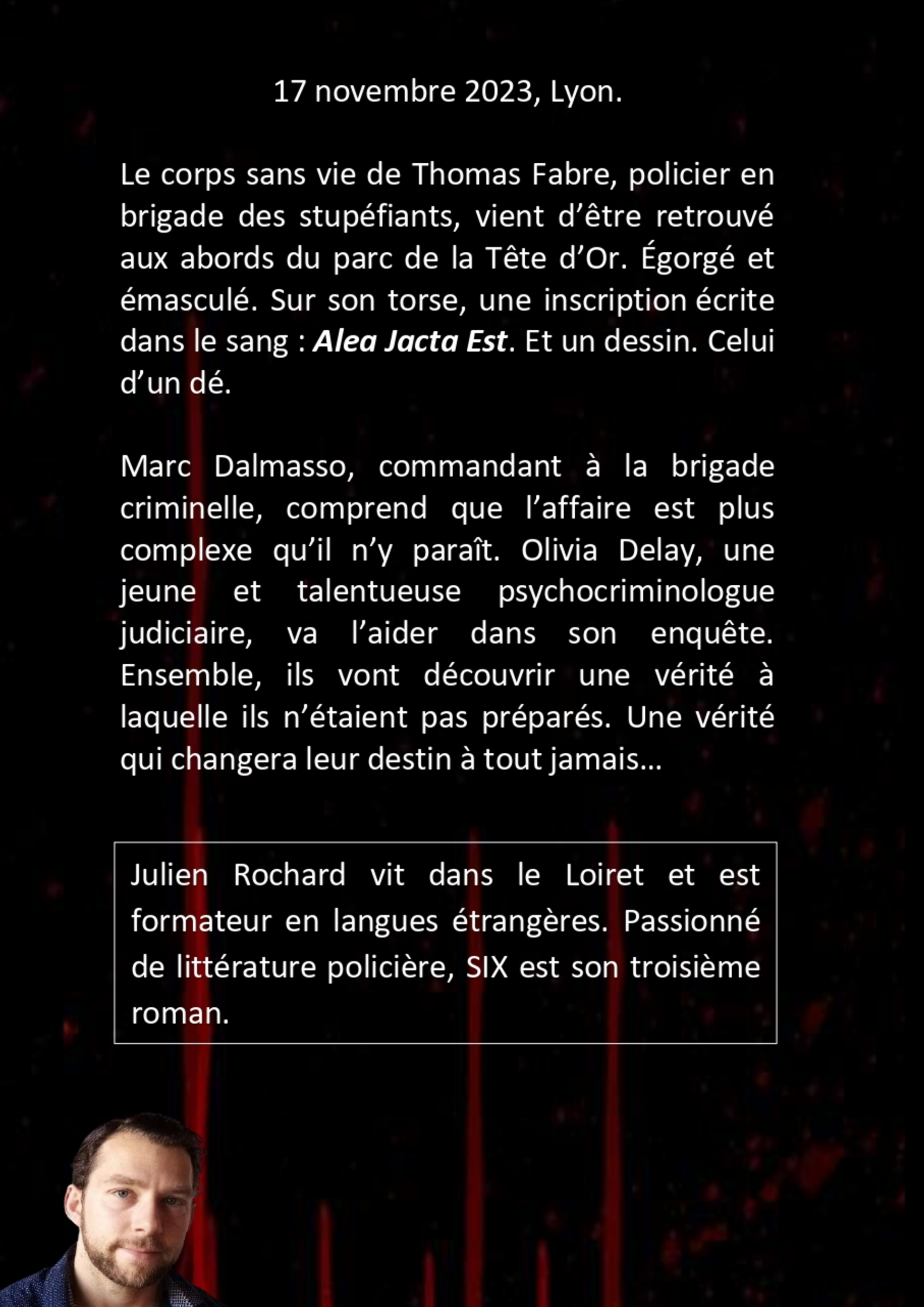 17 novembre 2023, Lyon. Le corps sans vie de Thomas Fabre, policier en brigade des stupéfiants, vient d’être retrouvé aux abords du parc de la Tête d’Or. Égorgé et émasculé. Un crime horrible mais qui n’a rien d’un hasard. Sur son torse, une inscription écrite dans le sang : Alea Jacta Est. Et un dessin. Celui d’un dé. Le chiffre 1. Marc Dalmasso, commandant à la Crim, comprend que l’affaire est plus complexe qu’il n’y paraît. Thomas Fabre n’est que le premier sur la liste. Olivia Delay, une jeune et talentueuse psychocriminologue judiciaire, va l’aider dans son enquête. Ensemble, ils vont découvrir une vérité à laquelle ils n’étaient pas préparés. Une vérité qui changera leur destin à tout jamais…